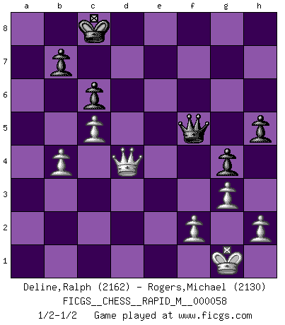 Last move : 1/2-1/2 2012 October 5 22:21:27 [Event "FICGS__CHESS__RAPID_M__000058"] [Site "FICGS"] [Date "2012.09.14"] [Round "1"] [White "Deline,Ralph"] [Black "Rogers,Michael"] [Result "1/2-1/2"] [WhiteElo "2162"] [BlackElo "2130"] 1.d4 f5 2.Nc3 Nf6 3.Bf4 e6 4.e3 Bb4 5.Nge2 O-O 6.a3 Ba5 7.Qd3 a6 8.g3 d6 9.Bg5 Nbd7 10.Bg2 h6 11.Bxf6 Nxf6 12.O-O c6 13.e4 fxe4 14.Nxe4 e5 15.dxe5 dxe5 16.Nd6 Qe7 17.Nxc8 Raxc8 18.Qe3 Nd5 19.Qb3 Kh8 20.c4 Nf6 21.Qc2 Rcd8 22.b4 Bc7 23.Nc3 Rd4 24.Ne4 Qf7 25.Nxf6 Qxf6 26.Rad1 a5 27.c5 axb4 28.Rxd4 exd4 29.axb4 g5 30.Be4 Kg7 31.Qd2 Be5 32.Qe2 Rf7 33.Qg4 d3 34.Bxd3 Qf3 35.Qc4 Qf6 36.Qc2 Bc3 37.Bc4 Rd7 38.Rd1 Rxd1+ 39.Qxd1 Bd4 40.Qd2 Kf8 41.Bb3 Ke7 42.Kg2 g4 43.Kf1 Kd7 44.Bc2 h5 45.Bg6 Qxg6 46.Qxd4+ Kc8 47.Qh8+ Kd7 48.Qc3 Qb1+ 49.Qe1 Qd3+ 50.Kg1 Qf3 51.Qd2+ Kc8 52.Qd6 Qf5 53.Qd4 1/2-1/2 Dutch Kingside Castling by player Black (move 5) Kingside Castling by player White (move 12) This chess game ended in a draw. Follow this game move after move (download)Though most people love to look at the games of the great attacking masters, some of the most successful players in history have been the quiet positional players. They slowly grind you down by taking away your space, tying up your pieces, and leaving you with virtually nothing to do ! (Yasser Seirawan) Ein Buch ist ein Spiegel; wenn ein Affe hineinsieht, so kann kein Apostel heraus gucken. (Georg Christoph Lichtenberg) Un jugador que es sorprendido, esta derrotado a medias. (Proverbio) Le succès, c'est être capable d'aller d'échec en échec sans perdre son enthousiasme. (Winston Churchill) Good decisions come from experience, and experience comes from bad decisions. (Anonymous)