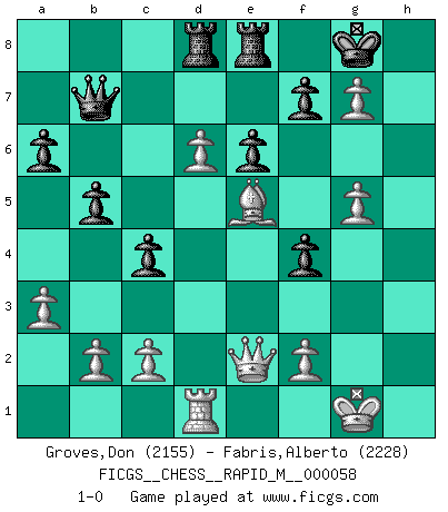 Last move : 1-0 2012 November 4 12:48:26 [Event "FICGS__CHESS__RAPID_M__000058"] [Site "FICGS"] [Date "2012.09.14"] [Round "1"] [White "Groves,Don"] [Black "Fabris,Alberto"] [Result "1-0"] [WhiteElo "2155"] [BlackElo "2228"] 1.e4 d5 2.exd5 Qxd5 3.Nc3 Qa5 4.d4 c6 5.Nf3 Nf6 6.Bd3 Bg4 7.O-O e6 8.h3 Bh5 9.Bf4 Nbd7 10.a3 Be7 11.Qe2 O-O 12.Bh2 Rfe8 13.g4 Bg6 14.Bxg6 hxg6 15.Rfe1 a6 16.Red1 Rac8 17.Ne5 Nxe5 18.dxe5 Nd5 19.Ne4 b5 20.h4 c5 21.Rd3 Kh7 22.Nd6 Bxd6 23.exd6 Rcd8 24.h5 g5 25.Rad1 c4 26.Rf3 Kg8 27.h6 Qb6 28.Be5 Nf4 29.Rxf4 gxf4 30.g5 Qb7 31.hxg7 1-0 Scandinavian (centre counter) defense Kingside Castling by player White (move 7) Kingside Castling by player Black (move 11) Player White won this chess game. Follow this game move after move (download)Openings teach you openings. Endgames teach you chess ! (Stephan Gerzadowicz) Ein Großmeister muß tausende Partien in seinem Kopf speichern, denn diese sind für Ihn, was die Worte der Muttersprache für gewöhnliche Leute sind, oder Noten für Musiker... (Garry Kasparov) El Ajedrez es un expediente tonto que hace creer a la gente inactiva que hacen una cosa muy astuta cuando solamente estan perdiendo su tiempo. (George Bernard Shaw) Fischer est le meilleur joueur du monde et Karpov n'est qu'un joueur de bistrot. (Garry Kasparov, agé de 16 ans) The Internet is the world's largest library. It's just that all the books are on the floor. (John Allen Paulos)