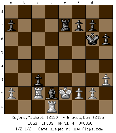 Last move : 1/2-1/2 2012 September 30 22:41:19 [Event "FICGS__CHESS__RAPID_M__000058"] [Site "FICGS"] [Date "2012.09.14"] [Round "1"] [White "Rogers,Michael"] [Black "Groves,Don"] [Result "1/2-1/2"] [WhiteElo "2130"] [BlackElo "2155"] 1.e4 e6 2.d4 d5 3.Nd2 c5 4.exd5 exd5 5.Ngf3 Nf6 6.Bb5+ Bd7 7.Bxd7+ Qxd7 8.O-O cxd4 9.Ne5 Qc8 10.Re1 Be7 11.c3 dxc3 12.Qa4+ Kf8 13.Ndf3 Nbd7 14.bxc3 Nxe5 15.Nxe5 Kg8 16.Rb1 Bd6 17.Qb3 Qf5 18.Qxb7 Rf8 19.Nc6 h6 20.Be3 Kh7 21.Rbd1 Rc8 22.h3 Rhe8 23.c4 Rc7 24.Qb5 Rxe3 25.Rxe3 Qc2 26.Rde1 Qxc4 27.Qxc4 dxc4 28.Ne5 c3 29.R3e2 Nd5 30.Nd3 Nf4 31.Nxf4 Bxf4 32.Rc2 Rb7 33.Rd1 Bd2 34.Kf1 Kg6 35.Ke2 Re7+ 1/2-1/2 French : Tarrasch, Open, 4.ed ed Kingside Castling by player White (move 8) This chess game ended in a draw. Follow this game move after move (download)Chess is 99 percent tactics. (Teichmann) Wenn Spassky eine Figur opfert kannst du genauso gut aufgeben. Aber wenn Tal eine Figur opfert, spiel weiter. Er könnte noch eine weitere opfern, und dann ... wer weiß? (Miguel Najdorf) Yo siempre he tenido un ligero sentimiento de lástima por una persona que no tiene conocimiento del Ajedrez. (Siegbert Tarrasch) Tous ces prétendus hommes politiques sont les pions, les Cavaliers, les Tours ou les Fous d'une partie d'échecs qui se jouera tant qu'un hasard ne renversera pas l'échiquier. (Honoré de Balzac) Two beer, or not two beer. (Unknown)