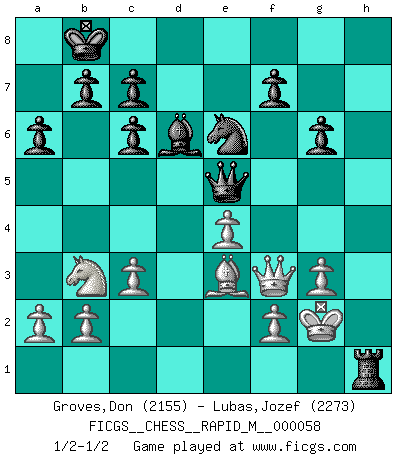 Last move : 1/2-1/2 2012 September 25 20:12:28 [Event "FICGS__CHESS__RAPID_M__000058"] [Site "FICGS"] [Date "2012.09.14"] [Round "1"] [White "Groves,Don"] [Black "Lubas,Jozef"] [Result "1/2-1/2"] [WhiteElo "2155"] [BlackElo "2273"] 1.e4 e5 2.Nf3 Nc6 3.Bb5 a6 4.Bxc6 dxc6 5.O-O Bg4 6.h3 h5 7.d3 Qf6 8.Nbd2 Ne7 9.Re1 Ng6 10.d4 Nf4 11.hxg4 hxg4 12.g3 gxf3 13.Qxf3 Ne6 14.dxe5 Qxe5 15.Nb3 Bd6 16.c3 g6 17.Kg2 O-O-O 18.Be3 Kb8 19.Rad1 Rh7 20.Rh1 Rdh8 21.Rxh7 Rxh7 22.Rh1 Rxh1 1/2-1/2 Ruy Lopez : Exchange variation, Alapin gambit Kingside Castling by player White (move 5) Queenside Castling by player Black (move 17) This chess game ended in a draw. Follow this game move after move (download)I look one move ahead... the best ! (Siegbert Tarrasch) Ich möchte Schüler heranbilden, die das Vermögen haben, selbst zu denken und Kritik zu üben. (Emanuel Lasker) El Rey es una pieza de pelea. ¡Usenlo!. (Wilhelm Steinitz) Aidez vos pièces, elles vous aideront. (Paul Morphy) There are two kinds of tragedy in this world, one is not getting what you want and the other is getting. (Lord of war)