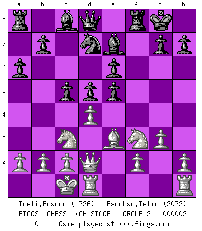 Last move : 0-1 2007 March 30 21:17:53 [Event "FICGS__CHESS__WCH_STAGE_1_GROUP_21__000002"] [Site "FICGS"] [Date "2007.01.16"] [Round "1"] [White "Iceli,Franco"] [Black "Escobar,Telmo"] [Result "0-1"] [WhiteElo "1726"] [BlackElo "2072"] 1.e4 c5 2.Nf3 e6 3.g3 Nf6 4.Nc3 d5 5.e5 Nfd7 6.Bb5 a6 7.Bxd7+ Nxd7 8.d4 Be7 9.Be3 O-O 10.Qd2 f6 11.O-O-O fxe5 0-1 This chess game has been lost on time (started : 2007.01.16 15:32:9) Sicilian defense Kingside Castling by player Black (move 9) Queenside Castling by player White (move 11) Player Black won this chess game. Follow this game move after move (download)I give 98 percent of my mental energy to Chess. Others give only 2 percent. (Bobby Fischer) Wie bekannt hörte Morphy 1859 auf, Schach zu spielen. Seine Enttäuschung galt nicht so sehr dem Schach, wie den Schachspielern. (Robert James Fischer) Aquel que teme a un Peón de Reina aislado, debería de retirarse del Ajedrez. (Siegbert Tarrasch) Les erreurs sont comme les malheurs, elles n'arrivent jamais seules. (Siegbert Tarrasch) Treat your password like your toothbrush. Don't let anybody else use it, and get a new one every six months. (Clifford Stoll)