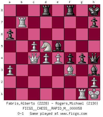 Last move : 0-1 2012 October 28 11:37:33 [Event "FICGS__CHESS__RAPID_M__000058"] [Site "FICGS"] [Date "2012.09.14"] [Round "1"] [White "Fabris,Alberto"] [Black "Rogers,Michael"] [Result "0-1"] [WhiteElo "2228"] [BlackElo "2130"] 1.c4 e5 2.g3 Nf6 3.Bg2 d5 4.cxd5 Nxd5 5.Nc3 Nb6 6.Nf3 Nc6 7.O-O Be7 8.a3 O-O 9.b4 Be6 10.Rb1 a6 11.d3 f5 12.Bb2 Qd6 13.Nd2 Rfd8 14.Nb3 Nd7 15.g4 Rf8 16.Qc2 Kh8 17.gxf5 Bxf5 18.Nd5 Bg5 19.Nc5 Nxc5 20.bxc5 Qh6 21.e3 Rad8 22.f4 exf4 23.e4 Be6 24.Nxc7 Bg4 25.Bf3 Bh3 26.Rfd1 Bf6 27.Nd5 Nd4 28.Bxd4 Bxd4+ 29.Kh1 g5 30.Qc4 Bg7 31.Rg1 Qh4 32.Rxb7 Be5 33.d4 g4 0-1 English Opening Kingside Castling by player White (move 7) Kingside Castling by player Black (move 8) Player Black won this chess game. Follow this game move after move (download)The beauty of a move lies not in its' appearance but in the thought behind it. (Siegbert Tarrasch) Bobby Fischer ist kein Vorbild für die heutige Jugend. (Viktor Kortschnoi) El Ajedrez demanda una total concentración. (Bobby Fischer) Tout change constamment, y compris dans le monde des Echecs. (Botvinnik) The general who wins the battle makes many calculations in his temple before the battle is fought. The general who loses makes but few calculations beforehand. (Sun Tzu)