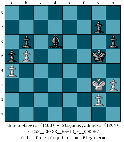 Last move : 0-1 2012 October 29 8:54:6 [Event "FICGS__CHESS__RAPID_E__000087"] [Site "FICGS"] [Date "2012.09.15"] [Round "1"] [White "Bromo,Alexis"] [Black "Stoyanov,Zdravko"] [Result "0-1"] [WhiteElo "1188"] [BlackElo "1204"] 1.d4 d5 2.c4 dxc4 3.Nc3 a6 4.e4 c6 5.Bxc4 e6 6.Nf3 Bb4 7.Bd2 h6 8.a3 Ba5 9.b4 Bb6 10.Be3 Nf6 11.e5 Ng4 12.h3 Nxe3 13.fxe3 O-O 14.O-O a5 15.b5 c5 16.Ne4 cxd4 17.exd4 Nd7 18.Rc1 Re8 19.a4 f5 20.Ng3 Nf8 21.Kh1 Ng6 22.Qd2 Nh4 23.Rcd1 Nxf3 24.Rxf3 Qh4 25.Kh2 Bd8 26.Re1 Be7 27.Qa2 Bb4 28.Re2 b6 29.d5 Bb7 30.Rd3 Rac8 31.dxe6 Rxc4 32.e7 Rxe7 33.Nxf5 Qf4+ 34.Ng3 Kh7 35.Qb1 Be4 36.Rxe4 Rxe4 37.Rd4 R7xe5 38.Rxe4 Rxe4 39.Kh1 Qxg3 40.Qxe4+ Qg6 41.Qxg6+ Kxg6 42.Kh2 Kg5 43.Kg3 Bd6+ 0-1 Queen's gambit accepted Kingside Castling by player Black (move 13) Kingside Castling by player White (move 14) Player Black won this chess game. Follow this game move after move (download)When you don't know what to play, wait for an idea to come into your opponent's mind. You may be sure that idea will be wrong. (Siegbert Tarrasch) Das Schachspiel ist ein See, in welchem eine Mücke baden und ein Elefant ertrinken kann. (Emanuel Lasker) El juego del Ajedrez no es solamente una diversión quieta; algunas cualidades muy valuables de la mente se pueden adquirir y cultivar con el, como convertirlos en habitos disponibles para toda ocasión; ya que la vida es algo así como el Ajedrez. (Benjamin Franklin) Il n'y a pas de prix trop élevé au scalp de l'ennemi. (Koblentz) All art requires courage. (Anne Tucker)
