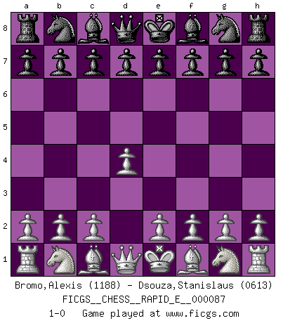 Last move : 1-0 2012 October 15 9:57:51 [Event "FICGS__CHESS__RAPID_E__000087"] [Site "FICGS"] [Date "2012.09.15"] [Round "1"] [White "Bromo,Alexis"] [Black "Dsouza,Stanislaus"] [Result "1-0"] [WhiteElo "1188"] [BlackElo "0613"] 1.d4 1-0 This chess game has been lost on time (started : 2012.09.15 1:21:50) Queen's pawn Player White won this chess game. Follow this game move after move (download)The winner of the game is the player who makes the next-to-last mistake. (Savielly Tartakover) Ich las kürzlich ein Buch von Nietzsche. Er sagte Religion verdumme nur die Menschen. Ich stimme zu. (Robert James Fischer) Cuando tu no sabes absolutamente que mas hacer, es tiempo de entrar en pánico. (John van der Wiel) Même un GMI sait rarement calculer sur plus de cinq coups une attaque à sacrifices. (Rudolf Spielmann) I feel so... helpless. (C-3PO in Star Wars ep.3)