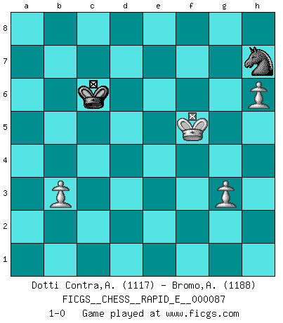 Last move : 1-0 2012 November 14 18:58:58 [Event "FICGS__CHESS__RAPID_E__000087"] [Site "FICGS"] [Date "2012.09.15"] [Round "1"] [White "Dotti Contra,Alessandro"] [Black "Bromo,Alexis"] [Result "1-0"] [WhiteElo "1117"] [BlackElo "1188"] 1.e4 e5 2.Nf3 Nc6 3.Bb5 d6 4.O-O Bd7 5.Bxc6 Bxc6 6.Nc3 Nf6 7.Re1 Be7 8.d4 exd4 9.Qxd4 h6 10.Bf4 Nh5 11.b3 O-O 12.Bd2 Bf6 13.e5 dxe5 14.Qxd8 Raxd8 15.Ne4 Bxe4 16.Rxe4 g5 17.Bc3 Nf4 18.Bxe5 Bxe5 19.Rxe5 Rfe8 20.Rxe8+ Rxe8 21.c4 c5 22.Kf1 f5 23.g3 Ng6 24.Re1 Rxe1+ 25.Nxe1 Kf7 26.Nd3 b6 27.b4 cxb4 28.Nxb4 Ke6 29.Ke2 Ne5 30.f4 Nxc4 31.Na6 Kd5 32.Kd3 Nd6 33.Nc7+ Kc5 34.Ne6+ Kd5 35.Nc7+ Kc6 36.Ne6 a5 37.Kd4 b5 38.fxg5 hxg5 39.Nxg5 b4 40.Nf3 a4 41.Nd2 Kb5 42.h4 b3 43.Nxb3 axb3 44.axb3 Ne4 45.h5 Nf6 46.h6 Kc6 47.Ke5 Nh7 48.Kxf5 1-0 Ruy Lopez : Old Steinitz defense Kingside Castling by player White (move 4) Kingside Castling by player Black (move 11) 10 pieces endgame at move 39 : White KNPPP , Black KNPPP WHITE : King + 1 Knight 3 Pawns BLACK : King + 1 Knight 3 Pawns 9 pieces endgame at move 43 : White KNPPP , Black KNPP WHITE : King + 1 Knight 3 Pawns BLACK : King + 1 Knight 2 Pawns 8 pieces endgame at move 43 : White KPPP , Black KNPP WHITE : King + 3 Pawns BLACK : King + 1 Knight 2 Pawns 7 pieces endgame at move 44 : White KPPP , Black KNP WHITE : King + 3 Pawns BLACK : King + 1 Knight 1 Pawn 6 pieces endgame at move 48 : White KPPP , Black KN WHITE : King + 3 Pawns BLACK : King + 1 Knight Player White won this chess game. Follow this game move after move (download)Winning isn't everything... but losing is nothing. (Mednis) Besser ein falscher Plan, logisch durchgeführt, als gar kein Plan. (Viktor Kortschnoi) Todo se encuentra en un estado de flujo y esto incluye al mundo del Ajedrez. (Mikhail Botvinnik) Un footballeur joue avec ses pieds, parfois avec sa tête. Un joueur d'échecs ne joue qu'avec sa tête. Et quand il ne joue plus, il meurt. (Jacob Murray) I don't know, I don't care, and it doesn't make any difference. (Albert Einstein)