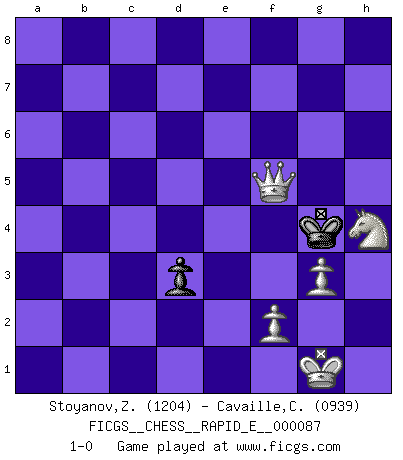 Last move : 1-0 2012 October 27 20:20:57 [Event "FICGS__CHESS__RAPID_E__000087"] [Site "FICGS"] [Date "2012.09.15"] [Round "1"] [White "Stoyanov,Zdravko"] [Black "Cavaille,Cedric"] [Result "1-0"] [WhiteElo "1204"] [BlackElo "0939"] 1.e4 c5 2.Nf3 d6 3.h3 Nf6 4.c3 a6 5.a3 b5 6.d3 Bb7 7.Bg5 e6 8.Be2 Be7 9.O-O O-O 10.Nbd2 Nc6 11.Re1 e5 12.b4 cxb4 13.axb4 a5 14.bxa5 Rxa5 15.Nb3 Rxa1 16.Qxa1 Qa8 17.Qb2 Na5 18.Ra1 Bd8 19.Nxa5 Bxa5 20.Qxb5 Qa6 21.Rxa5 Qxb5 22.Rxb5 Ba6 23.Rb6 Bc8 24.Bxf6 gxf6 25.Rxd6 Kg7 26.Nh4 Be6 27.Bg4 Bxg4 28.hxg4 Re8 29.Nf5+ Kg6 30.Nh4+ Kg5 31.g3 Re6 32.Rxe6 fxe6 33.c4 h5 34.gxh5 Kxh5 35.c5 Kg4 36.c6 f5 37.exf5 exf5 38.c7 e4 39.c8Q exd3 40.Qxf5+ 1-0 Sicilian Kingside Castling by player White (move 9) Kingside Castling by player Black (move 9) 10 pieces endgame at move 37 : White KNPPPPP , Black KPP WHITE : King + 1 Knight 5 Pawns BLACK : King + 2 Pawns 9 pieces endgame at move 37 : White KNPPPP , Black KPP WHITE : King + 1 Knight 4 Pawns BLACK : King + 2 Pawns Promotion Queen by player White (move 39) 8 pieces endgame at move 39 : White KQNPP , Black KPP WHITE : King + 1 Queen 1 Knight 2 Pawns BLACK : King + 2 Pawns 7 pieces endgame at move 40 : White KQNPP , Black KP WHITE : King + 1 Queen 1 Knight 2 Pawns BLACK : King + 1 Pawn Player White won this chess game. Follow this game move after move (download)Chess is in its essence a game, in its form an art, and in its execution a science. (Baron Tassilo) Bogoljubow: Matt in vier Zügen! Tartakower: Ich verbitte mir jede Belästigung! (Savielly Grigorievitsch Tartakower) Un jugador que trata de regresar una movida en el Ajedrez es un futuro carterista. (Richard Fenton) La vérité est comme le meilleur coup aux échecs : elle existe, mais il faut la chercher. (Arturo Perez-Reverte) Now the reason the enlightened prince and the wise general conquer the enemy whenever they move and their achievements surpass those of ordinary men is foreknowledge. (Sun Tzu)
