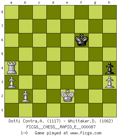 Last move : 1-0 2012 December 22 12:36:3 [Event "FICGS__CHESS__RAPID_E__000087"] [Site "FICGS"] [Date "2012.09.15"] [Round "1"] [White "Dotti Contra,Alessandro"] [Black "Whittaker,Deon"] [Result "1-0"] [WhiteElo "1117"] [BlackElo "1062"] 1.e4 e5 2.Nf3 Nc6 3.Bb5 Nge7 4.O-O a6 5.Ba4 d5 6.c3 b5 7.Bb3 a5 8.Re1 d4 9.Bd5 Nxd5 10.exd5 Qxd5 11.d3 Be7 12.Bg5 f6 13.Bh4 Bg4 14.Nbd2 O-O 15.h3 Bxf3 16.Nxf3 Rae8 17.a3 a4 18.Re4 g5 19.Rg4 Kh8 20.Qd2 Rg8 21.Ne1 Rg7 22.Nc2 Reg8 23.Nb4 Qd6 24.Bxg5 fxg5 25.Nxc6 Qxc6 26.cxd4 Bf6 27.Rc1 Qb6 28.Qb4 h5 29.Rg3 c6 30.Qd6 h4 31.Rf3 e4 32.Rxf6 Rh7 33.Rh6 R8g7 34.Rxh7+ Kxh7 35.dxe4 Qc7 36.Rxc6 Qxd6 37.Rxd6 g4 38.Kf1 gxh3 39.gxh3 Rc7 40.e5 Kg7 41.e6 Re7 42.d5 Kf6 43.Rb6 Ra7 44.Rxb5 Ke5 45.Ke2 Kd6 46.f4 Ke7 47.f5 Ra8 48.Rb7+ Kd6 49.Rd7+ Ke5 50.e7 Re8 51.f6 Kxf6 52.d6 Ke6 53.Rd8 Rxe7 54.dxe7 Kxe7 55.Rd4 Kf6 56.Rxa4 1-0 Ruy Lopez : Cozio defense Kingside Castling by player White (move 4) Kingside Castling by player Black (move 14) 10 pieces endgame at move 53 : White KRPPPP , Black KRPP WHITE : King + 1 Rook 4 Pawns BLACK : King + 1 Rook 2 Pawns 9 pieces endgame at move 54 : White KRPPPP , Black KPP WHITE : King + 1 Rook 4 Pawns BLACK : King + 2 Pawns 8 pieces endgame at move 54 : White KRPPP , Black KPP WHITE : King + 1 Rook 3 Pawns BLACK : King + 2 Pawns 7 pieces endgame at move 56 : White KRPPP , Black KP WHITE : King + 1 Rook 3 Pawns BLACK : King + 1 Pawn Player White won this chess game. Follow this game move after move (download)A good sacrifice is one that is not necessarily sound but leaves your opponent dazed and confused. (Rudolph Spielmann) Ihnen, Herr Lasker, habe ich nur drei Worte zu sagen: Schach und matt. (Siegbert Tarrasch) El sobresalir en el Ajedrez es un signo de una mente intrigante. (Sir Arthur Conan Doyle) Tous ces prétendus hommes politiques sont les pions, les Cavaliers, les Tours ou les Fous d'une partie d'échecs qui se jouera tant qu'un hasard ne renversera pas l'échiquier. (Honoré de Balzac) Never was anything great achieved without danger. (Niccolo Machiavelli)