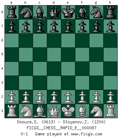 Last move : 0-1 2012 October 15 9:57:51 [Event "FICGS__CHESS__RAPID_E__000087"] [Site "FICGS"] [Date "2012.09.15"] [Round "1"] [White "Dsouza,Stanislaus"] [Black "Stoyanov,Zdravko"] [Result "0-1"] [WhiteElo "0613"] [BlackElo "1204"] 0-1 This chess game has been lost on time (started : 2012.09.15 1:21:50) Player Black won this chess game. Follow this game move after move (download)Chess holds its master in its own bonds, shackling the mind and brain so that the inner freedom of the very strongest must suffer. (Albert Einstein) Kleine Schachspieler machen Mist, und große Schachspieler machen Mist, aber große machen weniger Mist. (Fritz Sämisch) Una clavada es mas poderosa que una espada. (Fred Reinfeld) Les pièces de l'échiquier étaient impitoyables. Elles le retenaient, elles l'absorbaient. Il y avait de l'horreur en cela, mais aussi une harmonie unique. Car, qu'y a-t-il dans le monde, à part les échecs ? (V. Nabokov) Perhaps chess is the wrong game for the times (The Chess Master and the Computer, by Garry Kasparov - 2010)