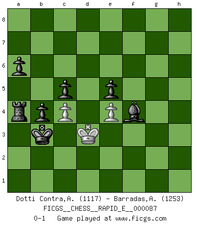 Last move : 0-1 2012 November 25 23:16:33 [Event "FICGS__CHESS__RAPID_E__000087"] [Site "FICGS"] [Date "2012.09.15"] [Round "1"] [White "Dotti Contra,Alessandro"] [Black "Barradas,Anderson"] [Result "0-1"] [WhiteElo "1117"] [BlackElo "1253"] 1.e4 c6 2.Nf3 d5 3.d3 dxe4 4.dxe4 Qxd1+ 5.Kxd1 Nf6 6.Nc3 Bg4 7.Be2 Nbd7 8.Bf4 Bxf3 9.Bxf3 e5 10.Be3 a6 11.Ke2 b5 12.Bg5 Be7 13.Bxf6 Nxf6 14.h3 b4 15.Na4 Rb8 16.b3 O-O 17.g4 Nd7 18.Rad1 Nb6 19.Nxb6 Rxb6 20.Rd7 Re8 21.h4 Rb5 22.g5 Ra5 23.Ra1 Kf8 24.Kd2 f6 25.Kd3 Rd8 26.Rxd8+ Bxd8 27.c3 c5 28.c4 fxg5 29.h5 h6 30.Bg4 Ke7 31.Bh3 Kf6 32.Ke3 g6 33.Bg4 gxh5 34.Bxh5 g4 35.Bxg4 Kg5 36.Kf3 h5 37.Bxh5 Kxh5 38.Kg2 Bg5 39.f3 Be3 40.Kf1 Bd4 41.a3 Bxa1 42.a4 Bd4 43.Kg2 Kh4 44.Kh2 Be3 45.Kg2 Bf4 46.Kf2 Kh3 47.Ke2 Kg3 48.Kf1 Kxf3 49.Ke1 Ke3 50.Kf1 Kd3 51.Ke1 Kc3 52.Ke2 Kxb3 53.Kd3 Rxa4 0-1 Caro-Kann defense Kingside Castling by player Black (move 16) 10 pieces endgame at move 53 : White KPP , Black KRBPPPP WHITE : King + 2 Pawns BLACK : King + 1 Rook 1 Bishop 4 Pawns Player Black won this chess game. Follow this game move after move (download)I'm not a materialistic person, in that, I don't suffer the lack or loss of money. The absence of worldly goods I don't look back on. For Chess is a way I can be as materialistic as I want without having to sell my soul. (Jamie Walter Adams) Ich würde die 30 stärksten Spieler der USA im Simultanspiel besiegen. (José Raúl Capablanca) Vive, pierde y aprende al observar a tu oponente como ganar. (Amber Steenbock) Les échecs c'est le défi de l'alpiniste, toujours plus haut, prêt à tout pour monter à l'assaut du Roi ennemi. Les échecs, c'est de la musique en mouvement, un ballet majestueux pour les yeux. C'est de la poésie composée par les fantômes du passé qui au même titre que Rimbaud ou Verlaine méritent notre admiration. Les échecs, c'est de la peinture ou le moindre mouvement modifie le tableau pour en faire un Picasso ou un Van Gogh. Les échecs, c'est tout et rien, c'est la vie et la mort. Jjulie33 sur le forum de France-Echecs. If computers get too powerful, we can organize them into committees. That'll do them in. (Anonymous)