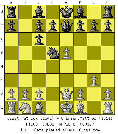 Last move : 1-0 2012 November 8 10:24:4 [Event "FICGS__CHESS__RAPID_C__000107"] [Site "FICGS"] [Date "2012.09.18"] [Round "1"] [White "Bizet,Patrick"] [Black "O Brien,Matthew"] [Result "1-0"] [WhiteElo "1541"] [BlackElo "1511"] 1.e4 e5 2.Nf3 Nc6 3.d4 exd4 4.Nxd4 Nf6 5.Nxc6 bxc6 6.e5 Qe7 7.Qe2 Nd5 8.g3 1-0 This chess game has been lost on time (started : 2012.09.18 15:56:22) Scotch : Mieses variation Player White won this chess game. Follow this game move after move (download)Up to this point White has been following well-known analysis. But now he makes a fatal error: he begins to use his own head. (Siegbert Tarrasch) Wir irren allesamt, nur jeder irrt anders. (Georg Christoph Lichtenberg) Un mal día en el Ajedrez, es mejor que cualquier buen día en el trabajo. (Anonymous) Même un GMI sait rarement calculer sur plus de cinq coups une attaque à sacrifices. (Rudolf Spielmann) Knowledge rests not upon truth alone, but upon error also. (Carl G. Jung)