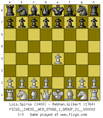 Last move : 1-0 2007 March 3 0:19:23 [Event "FICGS__CHESS__WCH_STAGE_1_GROUP_21__000002"] [Site "FICGS"] [Date "2007.01.16"] [Round "1"] [White "Lois,Spiros"] [Black "Rebhan,Gilbert"] [Result "1-0"] [WhiteElo "1400"] [BlackElo "1764"] 1.e4 1-0 This chess game has been lost on time (started : 2007.01.16 15:32:9) King's pawn Opening Player White won this chess game. Follow this game move after move (download)Bobby is the most misunderstood, misquoted celebrity walking the face of this earth. (Yasser Seirawan) Ohne Fehler kann es keine Brillanz geben. (Emanuel Lasker) Bobby es el jugador de Ajedrez mas fino que este país jamás haya producido. Su memoria para las movidas, su brillantez en soñar combinaciones y su feróz determinación por la victoria son algo extraño. (John Collins) Avant la finale, les dieux ont créé le milieu de partie. (Tarrasch) Knowledge rests not upon truth alone, but upon error also. (Carl G. Jung)