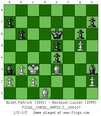 Last move : 1/2-1/2 2012 December 5 15:49:38 [Event "FICGS__CHESS__RAPID_C__000107"] [Site "FICGS"] [Date "2012.09.18"] [Round "1"] [White "Bizet,Patrick"] [Black "Boissier,Lucien"] [Result "1/2-1/2"] [WhiteElo "1541"] [BlackElo "1599"] 1.e4 c5 2.Nf3 Nc6 3.d4 cxd4 4.Nxd4 g6 5.Be3 Bg7 6.Nc3 Nf6 7.f3 O-O 8.Qd2 d5 9.O-O-O Nxd4 10.Bxd4 dxe4 11.Nxe4 Nxe4 12.fxe4 e5 13.Be3 Be6 14.Qxd8 Rfxd8 15.Be2 Bf8 16.Rxd8 Rxd8 17.Rd1 Rxd1+ 18.Bxd1 b6 19.b3 f5 20.g3 Ba3+ 21.Kd2 fxe4 22.g4 Kf7 23.g5 Bh3 24.Kc3 Ke6 1/2-1/2 Sicilian defense Kingside Castling by player Black (move 7) Queenside Castling by player White (move 9) This chess game ended in a draw. Follow this game move after move (download)Chess is so inspiring that I do not believe a good player is capable of having an evil thought during the game. (Wilhelm Steinitz) Der Knackpunkt bei der Konzentration ist, daß wir nur durch sie etwas Neues und Ungewöhnliches am Schachbrett finden können. Sie ist der einzige Weg durch neue neue Ideen eine Überraschung zu bereiten. (Garry Kasparov) EL Ajedrez es como la vida. (Boris Spassky) Un millionnaire : 'Monsieur Steinitz ! Vous ne participez aux tournois que pour l'argent, alors que moi je n'y viens que pour l'honneur.' Steinitz : 'Chacun joue pour ce qu'il n'a pas'... Unless I accept my faults I will most certainly doubt my virtues. (Hugh Prather)