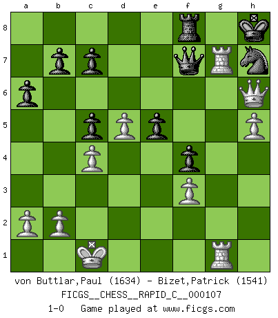 Last move : 1-0 2013 January 25 10:5:56 [Event "FICGS__CHESS__RAPID_C__000107"] [Site "FICGS"] [Date "2012.09.18"] [Round "1"] [White "von Buttlar,Paul"] [Black "Bizet,Patrick"] [Result "1-0"] [WhiteElo "1634"] [BlackElo "1541"] 1.d4 Nf6 2.c4 g6 3.Nc3 Bg7 4.e4 d6 5.f3 O-O 6.Be3 e5 7.d5 Ne8 8.Qd2 f5 9.exf5 gxf5 10.O-O-O f4 11.Bf2 Bf5 12.Bd3 Nd7 13.Ne4 Nef6 14.Ng5 Bxd3 15.Qxd3 Qc8 16.Ne6 Rf7 17.Ne2 h6 18.g4 Nf8 19.Nxg7 Kxg7 20.h4 N6d7 21.h5 a6 22.Rdg1 Nc5 23.Bxc5 dxc5 24.Nc3 Qd7 25.Ne4 Qe7 26.g5 hxg5 27.Nxg5 Kh8 28.Nxf7+ Qxf7 29.Rg4 Nh7 30.Qg6 Rf8 31.Rhg1 Nf6 32.Qh6+ Nh7 33.Rg7 1-0 King's Indian : Saemisch, Orthodox, 7.d5 Kingside Castling by player Black (move 5) Queenside Castling by player White (move 10) Player White won this chess game. Follow this game move after move (download)Live, lose, and learn, by observing your opponent how to win. (Amber Steenbock) Die meiste Zeit treffe ich auf Gegner, die meine Enkel sein könnten. Ich bin da, um ihnen zu zeigen, dass sie von mir noch einiges lernen können. (Viktor Kortschnoi) Un mal plan es mejor que no tener ningún plan. (Frank Marshall) Il vaut mieux sacrifier les pièces de l'adversaire. (Xavier Tartacover) Empty your mind, be formless, shapeless — like water. (Bruce Lee)