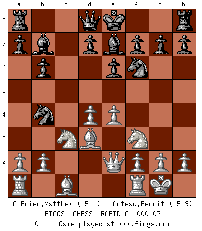 Last move : 0-1 2012 November 4 22:14:13 [Event "FICGS__CHESS__RAPID_C__000107"] [Site "FICGS"] [Date "2012.09.18"] [Round "1"] [White "O Brien,Matthew"] [Black "Arteau,Benoit"] [Result "0-1"] [WhiteElo "1511"] [BlackElo "1519"] 1.e4 b6 2.d4 Bb7 3.Bd3 e6 4.Nf3 c5 5.c3 Nf6 6.Qe2 Be7 7.O-O cxd4 8.cxd4 Nc6 9.Nc3 Nb4 0-1 This chess game has been lost on time (started : 2012.09.18 15:56:22) Owen defense Kingside Castling by player White (move 7) Player Black won this chess game. Follow this game move after move (download)When you are lonely, when you feel yourself an alien in the world, play Chess. This will raise your spirits and be your counselor in war. (Aristotle) Schach ist wie eine schöne Frau, zu der wir ständig zurückkehren, gleichviel, wie oft sie uns zurückweist. (Anonymous) La partida mas dura de ganar es una partida ganada. (Emanuel Lasker) Les Echecs mettent en conflit, non pas deux intelligences, mais deux volontés. (Lasker) Memory... is the diary that we all carry with us. (Oscar Wilde, The Importance of Being Earnest)