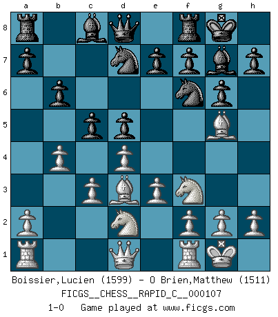 Last move : 1-0 2012 November 3 10:10:20 [Event "FICGS__CHESS__RAPID_C__000107"] [Site "FICGS"] [Date "2012.09.18"] [Round "1"] [White "Boissier,Lucien"] [Black "O Brien,Matthew"] [Result "1-0"] [WhiteElo "1599"] [BlackElo "1511"] 1.d4 Nf6 2.Nf3 g6 3.Bg5 Bg7 4.Nbd2 d5 5.e3 O-O 6.c3 Nbd7 7.Bd3 c5 8.O-O b6 9.b4 1-0 This chess game has been lost on time (started : 2012.09.18 15:56:22) King's Indian : Torre attack Kingside Castling by player Black (move 5) Kingside Castling by player White (move 8) Player White won this chess game. Follow this game move after move (download)There must have been a time when men were demigods, or they could not have invented Chess. (Gustav Schenk) Wer der Ansicht ist, daß alle Schachspieler verrückt sind, wird durch Studium des Lebens von Emil Josef Diemer nicht auf andere Gedanken kommen. (Hans Ree) El Ajedrez es un invernadero donde los frutos del carácter pueden madurar mas completamente que en la vida. (Edward Morgan Foster) Aux échecs, l'amour-propre est satisfait quand on remporte la victoire, mais il n'y a pas de honte à être battu. (Benjamin Franklin) Drag your thoughts away from your troubles... by the ears, by the heels, or any other way you can manage it. (Mark Twain)