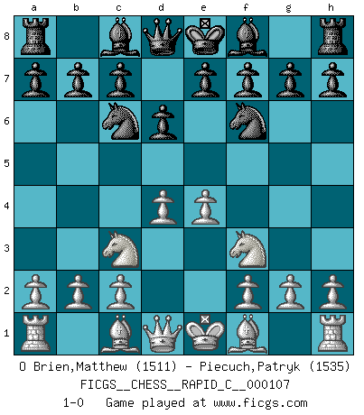Last move : 1-0 2012 November 11 17:49:21 [Event "FICGS__CHESS__RAPID_C__000107"] [Site "FICGS"] [Date "2012.09.18"] [Round "1"] [White "O Brien,Matthew"] [Black "Piecuch,Patryk"] [Result "1-0"] [WhiteElo "1511"] [BlackElo "1535"] 1.e4 Nc6 2.Nf3 d6 3.d4 Nf6 4.Nc3 1-0 KP : Nimzovich defense Player White won this chess game. Follow this game move after move (download)Dazzling combinations are for the many, shifting wood is for the few. (Georg Kieninger) Viele Opfer benötigen überhaupt keine konkrete Berechnung. Es genügt sich die entstehende Position kurz vorzustellen, um uns davon zu überzeugen, dass das Opfer korrekt ist. (Mikhail Nekhemyevich Tal) Las Aperturas te enseñan aperturas. ¡Los Finales te enseñan Ajedrez!. (Stephan Gerzadowicz) Il n'y a pas eu de défaite parce que je ne crois pas que cet ordinateur ait jamais existé. IBM a triché en refusant d'imprimer les modes de recherche de la machine. C'est évident, pendant le match, des coups décisifs ont été joués par des êtres humains. Aujourd'hui, les meilleurs spécialistes en informatique ne peuvent toujours pas expliquer comment Deep-Blue a pu jouer contre la logique des ordinateurs. IBM a gagné une guerre de communication, mais ils sont incapables de prouver que l'ordinateur a gagné tout seul. (Garry Kasparov) The Movers & Shakers of this world are those who play chess in the mornings and go to the disco in the evenings. (Dinesh De Silva)
