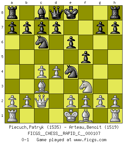 Last move : 0-1 2012 October 31 22:5:35 [Event "FICGS__CHESS__RAPID_C__000107"] [Site "FICGS"] [Date "2012.09.18"] [Round "1"] [White "Piecuch,Patryk"] [Black "Arteau,Benoit"] [Result "0-1"] [WhiteElo "1535"] [BlackElo "1519"] 1.d4 Nf6 2.c4 e6 3.Nf3 Bb4+ 4.Nc3 Nc6 5.Bd2 Bxc3 6.Bxc3 Ne4 7.Qc2 f5 0-1 This chess game has been lost on time (started : 2012.09.18 15:56:22) Bogo-Indian defense Player Black won this chess game. Follow this game move after move (download)The beauty of a move lies not in its' appearance but in the thought behind it. (Siegbert Tarrasch) Ich glaube, ich kenne inzwischen die Gründe für mein Versagen: schachliche Charakterfehler. Ich war nie ein Wunderkind und in meiner gesamten menschlichen Entwicklung immer zu langsam. (Viktor Kortschnoi) La última cosa en que Fischer estaba interesado era en tonterías, siempre y cuando el Ajedrez estuviera involucrado. (Elie Agur) Les pièces de l'échiquier étaient impitoyables. Elles le retenaient, elles l'absorbaient. Il y avait de l'horreur en cela, mais aussi une harmonie unique. Car, qu'y a-t-il dans le monde, à part les échecs ? (V. Nabokov) The intuitive mind is a sacred gift; the rational mind is a faithful servant. We have created a society that honors the servant but has forgotten the gift. (Albert Einstein)