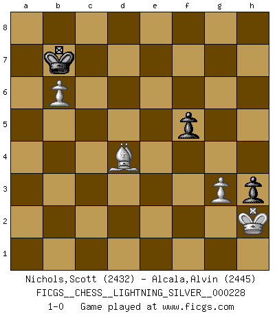 Last move : 1-0 2012 September 19 18:30:32 [Event "FICGS__CHESS__LIGHTNING_SILVER__000228"] [Site "FICGS"] [Date "2012.09.19"] [Round "1"] [White "Nichols,Scott"] [Black "Alcala,Alvin"] [Result "1-0"] [WhiteElo "2432"] [BlackElo "2445"] 1.e4 c5 2.Nc3 Nc6 3.g3 g6 4.Bg2 Bg7 5.d3 d6 6.f4 e6 7.Nf3 Nge7 8.Be3 Nd4 9.O-O O-O 10.e5 Nef5 11.Bf2 Nxf3+ 12.Qxf3 Rb8 13.Ne4 b6 14.g4 Bb7 15.Qh3 dxe5 16.gxf5 exf5 17.Nc3 exf4 18.Bxb7 Rxb7 19.Qf3 Re7 20.Qxf4 Rfe8 21.Rae1 Be5 22.Qf3 Re6 23.Re2 g5 24.Rfe1 Kg7 25.Kf1 f4 26.a4 h6 27.Nb5 Qd7 28.d4 a6 29.dxe5 axb5 30.a5 bxa5 31.Bxc5 Qc6 32.Qxc6 Rxc6 33.Bd6 Kg6 34.Rd2 Kf5 35.c3 b4 36.cxb4 axb4 37.Bxb4 Rxe5 38.Rxe5+ Kxe5 39.Bc3+ Kf5 40.Rd5+ Kg6 41.Rd3 Kf5 42.b4 h5 43.b5 Rc5 44.b6 Rb5 45.Bd4 Ke6 46.Rd2 Kd5 47.Rb2 Rxb2 48.Bxb2 Kc6 49.Be5 f3 50.Bd4 g4 51.Kf2 h4 52.Ke3 Kb7 53.Kf4 g3 54.hxg3 h3 55.Kxf3 f5 56.Kf2 Kc6 57.Kg1 Kb7 58.Kh2 1-0 Sicilian : Closed, 6.f4 Kingside Castling by player White (move 9) Kingside Castling by player Black (move 9) 10 pieces endgame at move 47 : White KBPP , Black KRPPPP WHITE : King + 1 Bishop 2 Pawns BLACK : King + 1 Rook 4 Pawns 9 pieces endgame at move 48 : White KBPP , Black KPPPP WHITE : King + 1 Bishop 2 Pawns BLACK : King + 4 Pawns 8 pieces endgame at move 54 : White KBPP , Black KPPP WHITE : King + 1 Bishop 2 Pawns BLACK : King + 3 Pawns 7 pieces endgame at move 55 : White KBPP , Black KPP WHITE : King + 1 Bishop 2 Pawns BLACK : King + 2 Pawns Player White won this chess game. Follow this game move after move (download)I am still a victim of Chess. It has all the beauty of art and much more. It cannot be commercialized. Chess is much purer than art in its social position. (Marcel Duchamp) Ich glaube, ich kenne inzwischen die Gründe für mein Versagen: schachliche Charakterfehler. Ich war nie ein Wunderkind und in meiner gesamten menschlichen Entwicklung immer zu langsam. (Viktor Kortschnoi) Si no le temes a Spassky, entonces elimino el elemento del dinero. (Jim Slater) Un millionnaire : 'Monsieur Steinitz ! Vous ne participez aux tournois que pour l'argent, alors que moi je n'y viens que pour l'honneur.' Steinitz : 'Chacun joue pour ce qu'il n'a pas'... Wipe them out. All of them. (Darth Sidious in Star Wars ep.1)