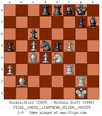 Last move : 1-0 2012 September 19 20:11:32 [Event "FICGS__CHESS__LIGHTNING_SILVER__000229"] [Site "FICGS"] [Date "2012.09.19"] [Round "1"] [White "Alcala,Alvin"] [Black "Nichols,Scott"] [Result "1-0"] [WhiteElo "2429"] [BlackElo "2448"] 1.c4 e5 2.Nc3 d6 3.g3 Nc6 4.Bg2 Nf6 5.d3 Be7 6.e3 O-O 7.Nge2 Bg4 8.h3 Bf5 9.g4 Bg6 10.f4 h6 11.f5 Bh7 12.O-O a5 13.Ng3 Qc8 14.b3 Nb4 15.a3 Na6 16.d4 c6 17.Bb2 Qd8 18.Qd3 Re8 19.Rae1 Rc8 20.Re2 Nb8 21.Bf3 Qb6 22.h4 Qxb3 23.g5 e4 24.Ngxe4 hxg5 25.Nxd6 Bxd6 26.hxg5 Nbd7 27.gxf6 Nxf6 28.c5 Bf8 29.Rg2 b5 30.e4 Nd7 31.Bd1 Qc4 32.Qxc4 bxc4 33.Be2 Rcd8 34.Rf4 Nf6 35.e5 Nd5 36.Rf3 f6 37.Bxc4 fxe5 38.Ne4 1-0 English Opening Kingside Castling by player Black (move 6) Kingside Castling by player White (move 12) Player White won this chess game. Follow this game move after move (download)Morphy was probably the greatest genius of them all. (Bobby Fischer) Das Schachspiel übertrifft alle anderen Spiele so weit wie der Chimborasso einen Misthaufen. (Arthur Schopenhauer) No es suficiente ser un buen jugador, se debe también de jugar bién. (Siegbert Tarrasch) Le jeu d'échecs fait naître et fortifie en nous plusieurs qualités précieuses dans le cours de l'existence, telles que la prévoyance, la circonspection, la prudence, et la persévérance. (Benjamin Franklin - 1783, la morale des échecs) Excelling at chess has long been considered a symbol of more general intelligence. That is an incorrect assumption in my view, as pleasant as it might be. But for the purposes of argument and investigation, chess is, in Russkin-Gutman's words, 'an unparalleled laboratory, since both the learning process and the degree of ability obtained can be objectified and quantified, providing an excellent comparative framework on which to use rigorous analytical techniques.' (The Chess Master and the Computer, by Garry Kasparov - 2010)
