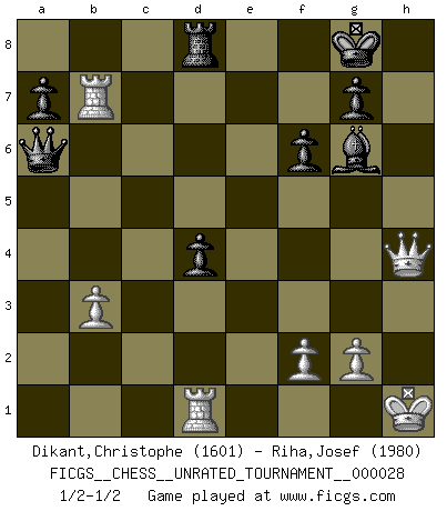 Last move : 1/2-1/2 2012 September 29 22:2:27 [Event "FICGS__CHESS__UNRATED_TOURNAMENT__000028"] [Site "FICGS"] [Date "2012.09.21"] [Round "1"] [White "Dikant,Christophe"] [Black "Riha,Josef"] [Result "1/2-1/2"] [WhiteElo "1601"] [BlackElo "1980"] 1.d4 Nf6 2.Nf3 e6 3.e3 d5 4.Bd3 c5 5.b3 cxd4 6.exd4 Bd6 7.O-O O-O 8.Re1 Nc6 9.a3 Qc7 10.Bb2 Rd8 11.Nbd2 Ng4 12.Bxh7+ Kxh7 13.Ng5+ Kg8 14.Qxg4 Bxh2+ 15.Kh1 Bf4 16.Ndf3 Bxg5 17.Nxg5 e5 18.Qh5 Bf5 19.dxe5 Bg6 20.Qh4 d4 21.e6 f6 22.e7 Nxe7 23.Ne6 Qxc2 24.Nxd8 Rxd8 25.Rxe7 Qxb2 26.Rd1 Qxa3 27.Rxb7 Qa6 28.Re7 Qa3 29.Rb7 Qa6 1/2-1/2 Queen's pawn : Yusupov-Rubinstein system Kingside Castling by player White (move 7) Kingside Castling by player Black (move 7) This chess game ended in a draw. Follow this game move after move (download)The passed pawn is a criminal, who should be kept under lock and key. Mild measures, such as police surveillance, are not sufficient. (Nimzovitch) Die FIDE ist dabei in die Hände der russischen Mafia zu fallen. (Larry Evans) Por esta medida (el intervalo entre Fischer y sus contemporaneos), yo le considero el mas grande campeón mundial. (Garry Kasparov) Les ravages du H expliquent la différence de niveau entre Tal et Thal [Abergel]. The difference between perseverance and obstinacy is that one comes from a strong will, and the other from a strong won't. (Henry Ward Beecher)