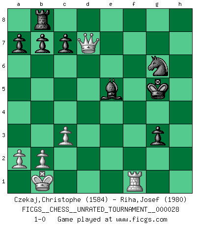 Last move : 1-0 2013 January 11 12:45:12 [Event "FICGS__CHESS__UNRATED_TOURNAMENT__000028"] [Site "FICGS"] [Date "2012.09.21"] [Round "1"] [White "Czekaj,Christophe"] [Black "Riha,Josef"] [Result "1-0"] [WhiteElo "1584"] [BlackElo "1980"] 1.Nc3 e6 2.d4 d5 3.e4 dxe4 4.Nxe4 Qd5 5.Bd3 f5 6.Ng3 Qxg2 7.Nf3 Qh3 8.Bg5 h6 9.Bf1 Qg4 10.h3 Qxg5 11.Nxg5 hxg5 12.Bd3 Nc6 13.c3 Bd6 14.Qe2 Kf7 15.O-O-O Nge7 16.Rde1 Nd5 17.Bc4 Nf4 18.Qc2 Kf6 19.Qd1 Bd7 20.Bf1 Rad8 21.Ne2 Nh5 22.Kb1 Ne7 23.Bg2 Bc6 24.Bxc6 Nxc6 25.Qb3 Rb8 26.Ng3 Nf4 27.Qc2 g6 28.Qd1 Rxh3 29.Rxh3 Nxh3 30.d5 exd5 31.Qxd5 Nxf2 32.Qe6+ Kg7 33.Nxf5+ gxf5 34.Qxf5 g4 35.Qxf2 g3 36.Qf5 Ne7 37.Qg5+ Kf7 38.Qh5+ Ng6 39.Qh7+ Kf6 40.Rf1+ Kg5 41.Qg7 Be5 42.Qd7 1-0 Dunst (Sleipner, Heinrichsen) Opening Queenside Castling by player White (move 15) Player White won this chess game. Follow this game move after move (download)Chess is a forcing house where the fruits of character can ripen more fully than in life. (Edward Morgan Foster) Im Fernschach kannst du während dem Spiel rauchen. (John Christen Knudsen) La única cosa que los jugadores de Ajedrez tienen en común, es el Ajedrez. (Lodewijk Prins) La vie et les Echecs sont tous les deux une lutte constante. (Lasker) Real knowledge is to know the extent of one's ignorance. (Confucius)