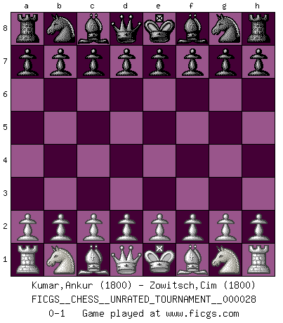 Last move : 0-1 2012 October 31 22:5:35 [Event "FICGS__CHESS__UNRATED_TOURNAMENT__000028"] [Site "FICGS"] [Date "2012.09.21"] [Round "1"] [White "Kumar,Ankur"] [Black "Zowitsch,Cim"] [Result "0-1"] [WhiteElo "1800"] [BlackElo "1800"] 0-1 This chess game has been lost on time (started : 2012.09.21 15:36:12) Player Black won this chess game. Follow this game move after move (download)If a ruler does not understand Chess, how can he rule over a kingdom ? (King Khusros II) Rubinstein ist ein Turmendspiel, welches die Götter vor tausenden von Jahren begannen. (Savielly Grigorievitsch Tartakower) No soy una persona materialista y por eso, no resiento la falta o pérdida del dinero. La ausencia de cosas mundanas carece de importancia. Ya que el Ajedrez es una forma en la que puedo ser tan materialista como yo desee sin tener la necesidad de vender mi alma. (Jamie Walter Adams) Le temps de noter son nom sur la feuille de partie, j'étais déjà en zeitnot ! D'un modeste amateur apparié lors de la première ronde d'un open contre le grand-maître Azmaïparashvili. Mandala - that's it! 16x16 squares as multiple of the four and the eight because of the Four Noble Truths and the Noble Eightfold Path. (Heinz-Georg Lehnhoff about Big Chess)