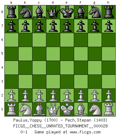 Last move : 0-1 2012 October 31 22:5:35 [Event "FICGS__CHESS__UNRATED_TOURNAMENT__000028"] [Site "FICGS"] [Date "2012.09.21"] [Round "1"] [White "Paulus,Yoppy"] [Black "Pech,Stepan"] [Result "0-1"] [WhiteElo "1700"] [BlackElo "1403"] 0-1 This chess game has been lost on time (started : 2012.09.21 15:36:12) Player Black won this chess game. Follow this game move after move (download)All my games are real. (Bobby Fischer) Ein Springer auf f6 gegen die eigene Rochadestellung ist schlimmer als ein rostiger Nagel im Knie. (Efim Bogoljubov) Si el ingenio solamente fuese necesario para lucirse, las mujeres serían las mejores jugadoras de Ajedrez del mundo. (Albin) On entre au jeu d'Echecs comme on entre en Religion. Pour le joueur d'Echecs, la partie d'Echecs c'est l'office, la messe, le défilé du 1er Mai, le dépôt de gerbe au Monument aux Morts. C'est un drame sacré. (Michel Roos) See no evil, hear no evil, speak no evil. (The 3 monkeys)