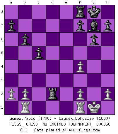 Last move : 0-1 2012 October 12 19:10:42 [Event "FICGS__CHESS__NO_ENGINES_TOURNAMENT__000058"] [Site "FICGS"] [Date "2012.09.22"] [Round "1"] [White "Gomez,Pablo"] [Black "Czudek,Bohuslav"] [Result "0-1"] [WhiteElo "1700"] [BlackElo "1800"] 1.e3 c5 2.d3 d5 3.Nf3 Nf6 4.Be2 g6 5.Nbd2 Bg7 6.c3 O-O 7.Nb3 b6 8.Bd2 Bb7 9.Qc2 Nbd7 10.c4 e5 11.e4 dxe4 12.dxe4 Nxe4 13.Bd3 Nxd2 14.Qxd2 e4 15.Bxe4 Bxe4 16.O-O Bxf3 17.gxf3 Ne5 18.Qxd8 Raxd8 19.f4 Nxc4 20.Rab1 Nd2 21.Nxd2 Rxd2 0-1 Bohuslav Czudek Thank you for this game and correct playing ! Pablo Gomez Thank you for the game. Best Regards. Van't Kruijs Opening Kingside Castling by player Black (move 6) Kingside Castling by player White (move 16) Player Black won this chess game. Follow this game move after move (download)My God, Bobby Fischer plays so simply. (Alexei Suetin) Wenn ich mich einlogge, glauben die Leute gewöhnlich nicht, dass ich es selbst bin und sie fangen an, mir dumme Fragen zu stellen. Und wenn sie es glauben, stellen sie wieder andere dumme Fragen. (Judith Polgar) En el tablero, la mentira e hipocresía no sobreviven mucho. (Emanuel Lasker) Les Echecs représentent une sphère d'idées créatrices basée sur la volonté des deux protagonistes. (Smyslov) Before all elsed, be armed. (Niccolo Machiavelli)