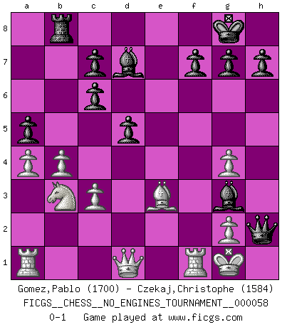 Last move : 0-1 2012 December 3 19:19:28 [Event "FICGS__CHESS__NO_ENGINES_TOURNAMENT__000058"] [Site "FICGS"] [Date "2012.09.22"] [Round "1"] [White "Gomez,Pablo"] [Black "Czekaj,Christophe"] [Result "0-1"] [WhiteElo "1700"] [BlackElo "1584"] 1.e3 e5 2.d3 d5 3.d4 Nc6 4.Ne2 Nf6 5.Ng3 Bd6 6.Be2 O-O 7.c3 a5 8.a4 Re8 9.Bb5 Bd7 10.Bxc6 bxc6 11.O-O Rb8 12.Nd2 Ng4 13.h3 exd4 14.hxg4 dxe3 15.fxe3 Bxg3 16.b4 Rxe3 17.Nb3 Qh4 18.Bxe3 Qh2+ 0-1 Van't Kruijs Opening Kingside Castling by player Black (move 6) Kingside Castling by player White (move 11) Player Black won this chess game. Follow this game move after move (download)The game of Chess is not merely an idle amusement; several very valuable qualities of the mind are to be acquired and strengthened by it, so as to become habits ready on all occasions; for life is a kind of Chess. (Benjamin Franklin) Dass jemand wie Surab Asmaiparaschwili, der selbst Elopunkte gekauft hat , Vize-Präsident der Fide werden konnte, sagt schon einges über den Zustand dieser Organisation aus. (Joel Lautier) Una de estas pequeñas movidas modestas pudieran ser mas molestas a tu oponente que la amenaza mas grande. (Siegbert Tarrasch) L'ordinateur a tué l'originalité. Il n'y a plus guère d'aventures sur l'échiquier. (Jacob Murray) Better than a thousand days of diligent study is one day with a great teacher. (Japanese proverb)