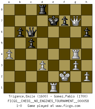 Last move : 1-0 2012 November 12 11:51:22 [Event "FICGS__CHESS__NO_ENGINES_TOURNAMENT__000058"] [Site "FICGS"] [Date "2012.09.22"] [Round "1"] [White "Trigance,Emile"] [Black "Gomez,Pablo"] [Result "1-0"] [WhiteElo "1600"] [BlackElo "1700"] 1.b4 e6 2.Bb2 d6 3.g3 e5 4.Bg2 Nf6 5.c4 Be7 6.a3 Nbd7 7.d3 c5 8.b5 a6 9.a4 axb5 10.cxb5 b6 11.Bxa8 d5 12.Bc6 O-O 13.e3 Nb8 14.Bxe5 Nxc6 15.bxc6 Bd6 16.Bb2 Qe7 17.Nd2 Be5 18.Bxe5 Qxe5 19.Ngf3 Qe6 20.Rb1 Qxc6 21.Ne5 Qb7 22.Rg1 Qc7 23.f4 Nd7 24.Nxd7 Bxd7 25.Qb3 Rb8 26.Kf2 h6 27.Nf3 Be6 28.Qb5 d4 29.Rgc1 dxe3+ 30.Kxe3 g5 31.Rb4 gxf4+ 32.Rxf4 Bd5 33.Qb2 Re8+ 34.Kf2 Bxf3 35.Kxf3 Qc6+ 36.Kf2 Rd8 37.Rg4+ Kf8 38.Qg7+ Ke7 39.Re1+ 1-0 Polish (Sokolsky) opening Kingside Castling by player Black (move 12) Player White won this chess game. Follow this game move after move (download)In Fischer's hands, a slight theoretical advantage is as good a being a Queen ahead. (Isaac Kashdan) Irgendwie scheint mir sonntags früh um 9 Uhr der Killerinstinkt verloren gegangen zu sein. (Alexej Shirov) Hay jugadores fuertes y personas amables y yo soy un jugador fuerte. (Bobby Fischer) Il vaut toujours mieux jouer un plan faux de façon logique que de n'avoir pas de plan du tout. (Victor Kortchnoï) Humor is by far the most significant activity of the human brain. (Edward De Bono)