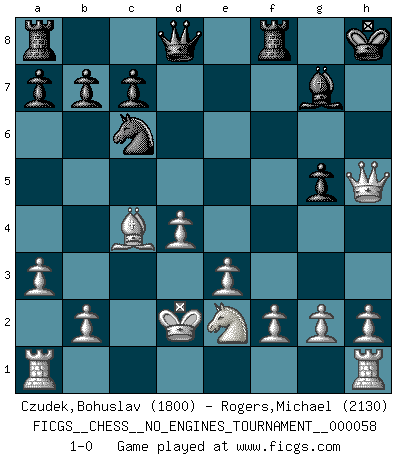 Last move : 1-0 2012 October 8 20:54:56 [Event "FICGS__CHESS__NO_ENGINES_TOURNAMENT__000058"] [Site "FICGS"] [Date "2012.09.22"] [Round "1"] [White "Czudek,Bohuslav"] [Black "Rogers,Michael"] [Result "1-0"] [WhiteElo "1800"] [BlackElo "2130"] 1.d4 f5 2.c4 Nf6 3.Nc3 e6 4.e3 g6 5.Bd3 Bg7 6.Bd2 O-O 7.Qc2 Nc6 8.a3 d5 9.Nge2 Ne4 10.cxd5 exd5 11.Nxd5 Nxd2 12.Kxd2 Be6 13.Ndf4 Bf7 14.Qc5 g5 15.Qxf5 Bg6 16.Qe6+ Bf7 17.Qe4 Bg6 18.Nxg6 hxg6 19.Qe6+ Kh8 20.Qxg6 Kg8 21.Bc4+ Kh8 22.Qh5+ 1-0 Bohuslav Czudek Thank you for this game and correct playing ! Dutch with c4 & Nc3 Kingside Castling by player Black (move 6) Player White won this chess game. Follow this game move after move (download)A great player and a great example for many. His book My 60 Memorable Games had a big impact on me. It is a shame he didn't continue to enrich the world of chess with his unparalleled understanding after 1972. (Jan Timman, about Bobby Fischer's death) Schach ist ein Teil der Kultur, und wenn es mit der Kultur abwärts geht, geht es auch mit dem Schach abwärts. (Mikhail Moiseyevich Botvinik) Yo no creo en la psicología. Yo creo en las buenas movidas. (Bobby Fischer) Les échecs, c'est l'imagination. (David Bronstein) Vladimir Ras-Putin is still alive... He is also a good actor, I saw him in the Lord of the Rings. (Rodolfo d'Ettorre)