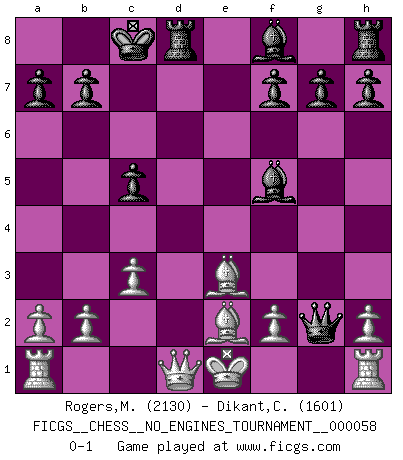 Last move : 0-1 2012 September 23 22:49:56 [Event "FICGS__CHESS__NO_ENGINES_TOURNAMENT__000058"] [Site "FICGS"] [Date "2012.09.22"] [Round "1"] [White "Rogers,Michael"] [Black "Dikant,Christophe"] [Result "0-1"] [WhiteElo "2130"] [BlackElo "1601"] 1.e4 d5 2.exd5 Nf6 3.Nc3 Nxd5 4.d4 Nc6 5.Nf3 Bf5 6.Nxd5 Qxd5 7.c3 O-O-O 8.Be2 e5 9.Be3 exd4 10.Nxd4 Nxd4 11.Bxd4 c5 12.Be3 Qxg2 0-1 Scandinavian defense Queenside Castling by player Black (move 7) Player Black won this chess game. Follow this game move after move (download)By this measure (on the gap between Fischer & his contemporaries), I consider him the greatest world champion. (Garry Kasparov) Wer mein Gambit spielt, muß bereit sein, alle Brücken hinter sich abzubrechen. Es verändert den ganzen Menschen. Es wirkt wie ein Zauberstab und fördert verkümmerte, gute Charakter- eigenschaften wieder zu Tage. (Emil Joseph Diemer) Me gusta decir que Bobby Fischer fue el mejor jugador que jamás haya existido. Pero lo que hizo de Fischer un genio, fue su habilidad de mezclar una frescura y pragmatismo Americano con ideas Rusas acerca de la estrategia. (Bruce Pandolfini) Toute estimation doit être constamment réévaluée. (Jacob Estrin) The modern world has divided itself into Conservatives and Progressives. The business of Progressives is to go on making mistakes. The business of the Conservatives is to prevent the mistakes from being corrected. (G.K. Chesterton)