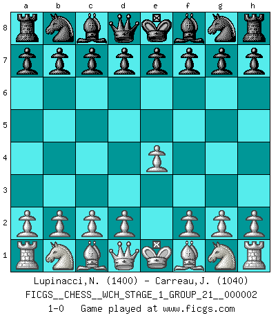 Last move : 1-0 2007 February 15 22:29:16 [Event "FICGS__CHESS__WCH_STAGE_1_GROUP_21__000002"] [Site "FICGS"] [Date "2007.01.16"] [Round "1"] [White "Lupinacci,Nicola"] [Black "Carreau,Jean-Francois"] [Result "1-0"] [WhiteElo "1400"] [BlackElo "1040"] 1.e4 1-0 This chess game has been lost on time (started : 2007.01.16 15:32:9) King's pawn Opening Player White won this chess game. Follow this game move after move (download)The defensive power of a pinned piece is only imaginary. (Aaron Nimzovich) Es ist nicht das erste mal, dass sich die FIDE dem Arabischen Geld gebeugt hat (über die FIDE WM 2004 in Lybien). (Larry Evans) Por la belleza de sus partidas, la claridad de su juego y lo brillante de sus ideas, Fischer se creó el mismo como un artista de la misma estatura como Brahms, Rembrandt y Shakespeare. (David Levy) Les Echecs ne sont pas pour les âmes timides. Ils requièrent un homme entier, qui ne s'arrête pas aveuglément à ce qui a été déjà établi, mais qui tente individuellement de sonder les profondeurs du jeu. (W. Steinitz) The greatest con, that he ever pulled... was making you believe... that he is you. (Revolver, movie)