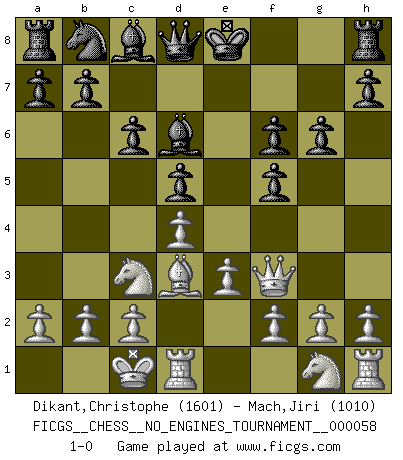 Last move : 1-0 2012 November 5 20:39:41 [Event "FICGS__CHESS__NO_ENGINES_TOURNAMENT__000058"] [Site "FICGS"] [Date "2012.09.22"] [Round "1"] [White "Dikant,Christophe"] [Black "Mach,Jiri"] [Result "1-0"] [WhiteElo "1601"] [BlackElo "1010"] 1.d4 f5 2.Nc3 Nf6 3.Bg5 d5 4.Bxf6 exf6 5.e3 c6 6.Bd3 Bd6 7.Qf3 g6 8.O-O-O 1-0 This chess game has been lost on time (started : 2012.09.22 9:29:35) Dutch Queenside Castling by player White (move 8) Player White won this chess game. Follow this game move after move (download)Robert Fischer is a law unto himself. (Larry Evans) Ich suche im Schach immer etwas Eigenes. Riskantes Spiel im Stile schachlicher Musketiere ist nicht meine Sache, auch wenn es vielen Freunden scharfer Wendungen gefällt. (Anatoly Karpov) Una mala movida nulifica cuarenta buenas. (Horowitz) Fischer est le meilleur joueur du monde et Karpov n'est qu'un joueur de bistrot. (Garry Kasparov, agé de 16 ans) Crush them ! Make them suffer ! (General Grievous in Star Wars ep.3)
