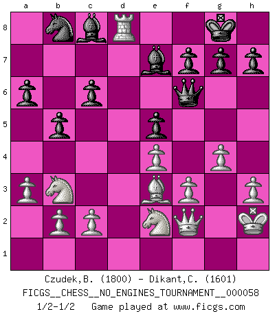 Last move : 1/2-1/2 2012 October 30 21:23:19 [Event "FICGS__CHESS__NO_ENGINES_TOURNAMENT__000058"] [Site "FICGS"] [Date "2012.09.22"] [Round "1"] [White "Czudek,Bohuslav"] [Black "Dikant,Christophe"] [Result "1/2-1/2"] [WhiteElo "1800"] [BlackElo "1601"] 1.d4 d6 2.e4 Nf6 3.Nc3 e5 4.Nf3 Nbd7 5.Bc4 Be7 6.h3 O-O 7.Be3 c6 8.Bb3 b5 9.dxe5 dxe5 10.a3 Bb7 11.O-O Qc7 12.Nd2 a6 13.f3 Rad8 14.Qe2 Nh5 15.Qf2 Nf4 16.Kh2 Qd6 17.g3 Ne6 18.Bxe6 Qxe6 19.Nb3 Bc8 20.g4 Qf6 21.Rad1 Nb8 22.Ne2 Rxd1 23.Rxd1 Rd8 24.Rxd8+ 1/2-1/2 Bohuslav Czudek Thank you for this game and correct playing ! Queen's Pawn Kingside Castling by player Black (move 6) Kingside Castling by player White (move 11) This chess game ended in a draw. Follow this game move after move (download)Chess holds its master in its own bonds, shackling the mind and brain so that the inner freedom of the very strongest must suffer. (Albert Einstein) Die unerbitterlichsten Regeln im Schach sind die Ausnahmen. (Savielly Grigorievitsch Tartakower) El Ajedrez es 99 por ciento táctica. (Teichmann) Vous n'êtes pas toujours obligé de jouer le meilleur coup. Un coup doit être actif, entreprenant, correct et beau ! (David Bronstein) All war is based on deception. (Sun Tzu)
