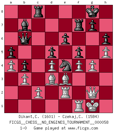 Last move : 1-0 2013 March 28 19:1:12 [Event "FICGS__CHESS__NO_ENGINES_TOURNAMENT__000058"] [Site "FICGS"] [Date "2012.09.22"] [Round "1"] [White "Dikant,Christophe"] [Black "Czekaj,Christophe"] [Result "1-0"] [WhiteElo "1601"] [BlackElo "1584"] 1.d4 Nf6 2.Nf3 d5 3.e3 e6 4.Bd3 c5 5.b3 Nc6 6.O-O Bd6 7.Bb2 O-O 8.a3 Qc7 9.Nbd2 cxd4 10.exd4 b6 11.Re1 Bb7 12.Ne5 Rac8 13.Qf3 h6 14.Qh3 a6 15.f4 b5 16.Ndf3 Rfe8 17.g4 Bxe5 18.Nxe5 Ne4 19.Qg2 f6 20.Nxc6 Bxc6 21.Rf1 a5 22.Rae1 b4 23.a4 Bb7 24.h4 f5 25.h5 Rf8 26.Re2 Rf7 27.Bc1 Qb6 28.Be3 1-0 This chess game has been lost on time (started : 2012.09.22 9:29:35) Queen's pawn game Kingside Castling by player White (move 6) Kingside Castling by player Black (move 7) Player White won this chess game. Follow this game move after move (download)We must make sure that Chess will not be like a dead language, very interesting, but for a very small group. (Sytze Faber) Ein guter Spieler hat immer Glück. (José Raúl Capablanca) Me dio la sensación de como si yo estuviera jugando en contra del mismo Ajedrez. - al estar jugando en contra de Robert Fischer (Walter Shipman) Demandez au pauvre Cg1 ce qu'il en pense. Eduard Gufeld à propos de la variante Saemisch de l'Est-Indienne. Chess is everything: art, science and sport. (Anatoly Karpov)