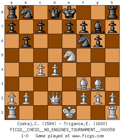 Last move : 1-0 2012 November 12 21:23:53 [Event "FICGS__CHESS__NO_ENGINES_TOURNAMENT__000058"] [Site "FICGS"] [Date "2012.09.22"] [Round "1"] [White "Czekaj,Christophe"] [Black "Trigance,Emile"] [Result "1-0"] [WhiteElo "1584"] [BlackElo "1600"] 1.d4 b6 2.e4 Bb7 3.Nc3 g6 4.Be3 Bg7 5.Qd2 d5 6.Nxd5 Bxd5 7.exd5 Qxd5 8.Be2 Qd7 9.Nf3 Nf6 10.Ne5 Qd6 11.Bf4 Nd5 12.Bg3 Qd8 13.c4 Nf6 14.Bf3 1-0 Queen's pawn : English defense Player White won this chess game. Follow this game move after move (download)One bad move nullifies forty good ones. (Horowitz) Sitze auf Deine Hände. (Siegbert Tarrasch) Cada Peón es una Reina en potencia. (James Mason) Pour se monter efficace, un Cavalier a besoin d'avant-postes ! Les Cavaliers font les meilleurs bloqueurs de pions passés. There's no money in correspondence chess. (John Knudsen)