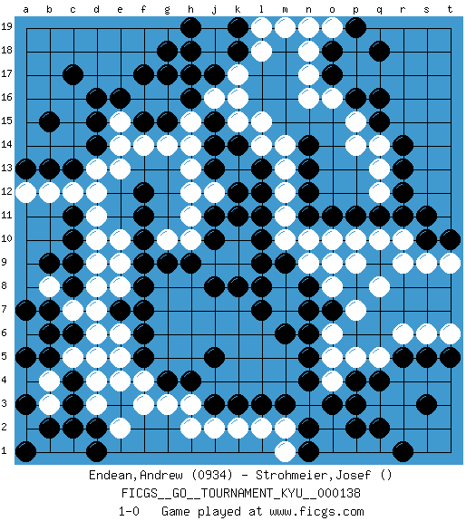Last move : 1-0 2013 May 17 21:4:56 [Event "FICGS__GO__TOURNAMENT_KYU__000138"] [Site "FICGS"] [Date "2012.09.22"] [Round "1"] [Black "Endean,Andrew"] [White "Strohmeier,Josef"] [Result "1-0"] [Rating 1 "0934"] 1.q4 k16 2.q16 n16 3.r14 d4 4.d16 g16 5.d14 e13 6.f17 f16 7.e16 e15 8.d15 e14 9.g17 h17 10.h18 j18 11.h19 j19 12.g18 d13 13.f15 g14 14.h16 j16 15.g15 f14 16.j17 k17 17.h17 h15 18.c13 c12 19.b13 b12 20.a13 a12 21.b15 p15 22.p16 o16 23.o17 n17 24.o18 n18 25.k18 l18 26.k19 o4 27.o3 n3 28.p3 q5 29.r5 p5 30.p4 o2 31.p2 p1 32.n2 o1 33.n1 q1 34.q2 m2 35.r1 r6 36.s5 s6 37.t5 t6 38.s3 l19 39.n4 o5 40.m3 l2 41.l3 k2 42.k3 j2 43.j3 h2 44.c3 d3 45.c4 c5 46.b5 b6 47.c6 d5 48.b7 a6 49.a5 q14 50.q15 p14 51.r13 q13 52.m6 m7 53.l7 n7 54.n6 o6 55.n5 c7 56.a7 d6 57.b6 b8 58.c8 d7 59.b9 d8 60.c9 d9 61.c10 d10 62.c11 d11 63.l8 m8 64.q11 h3 65.h4 g3 66.g4 f4 67.f5 e4 68.f6 f3 69.f8 e8 70.e7 e6 71.f7 d12 72.m9 q10 73.o7 o8 74.n8 o9 75.o11 n10 76.n11 p7 77.n7 p10 78.p11 m10 79.l10 m11 80.l11 m12 81.n12 o10 82.r12 o19 83.p19 n19 84.q18 q12 85.r11 r10 86.s10 s9 87.t10 t9 88.s11 r9 89.l12 m13 90.l13 l14 91.k14 l15 92.j13 h12 93.h9 h10 94.j10 h11 95.j11 j12 96.k12 c2 97.b2 b1 98.d2 c1 99.d1 b3 100.a1 n9 101.g9 g10 102.f10 h13 103.j15 h14 104.j14 b4 105.c2 m1 106.p8 q8 107.c17 e10 108.f11 e9 109.f9 p9 110.f12 k9 111.k8 j9 112.j8 k10 113.k11 e5 114.j5 k15 115.l9 m19 116.n13 m14 117.n14 e2 118.a3 1-0 Here are the names of the openings (joseki) played in the four corners : Corner q16 : q16 n16 Hoshi (Hwajeom, Seongjeom, Xingwei`) 4-4 Point. The star or hoshi (4-4) point, emphasizing influence at the potential expense of territory. Niken Takagakari (Dukan Nop'dakeolch'im, E`r Gaojia, 2-Space High Approach). White 2 is a light approach move. Rarely played in even games, White 2 is typically employed in handicap games. Black continues with 6-4 or 3-10. In Korean Sunjang Baduk Black has a stone on 8-4. Corner d16 : d16 g16 Hoshi (Hwajeom, Seongjeom, Xingwei`) 4-4 Point. The star or hoshi (4-4) point, emphasizing influence at the potential expense of territory. Niken Takagakari (Dukan Nop'dakeolch'im, E`r Gaojia, 2-Space High Approach). White 2 is a light approach move. Rarely played in even games, White 2 is typically employed in handicap games. Black continues with 6-4 or 3-10. In Korean Sunjang Baduk Black has a stone on 8-4. Corner q4 : q4 o4 Hoshi (Hwajeom, Seongjeom, Xingwei`) 4-4 Point. The star or hoshi (4-4) point, emphasizing influence at the potential expense of territory. Ikken Takagakari (Hankan Nop'dakeolch'im, Yi Gaojia, 1-Space High Approach). Black typically responds at 6-4 or 3-10. Black 4-10 is played when Black finds play on the right side advantageous. Black 4-8 or 3-8 may be played when Black has support at top. Player Black won this Go (weiqi, baduk) game. Follow this game move after move (download)In the corner, five stones in a row on the third line are alive. (Anonymous) The mind is like a parachute, it only functions when its open. (Unknown)