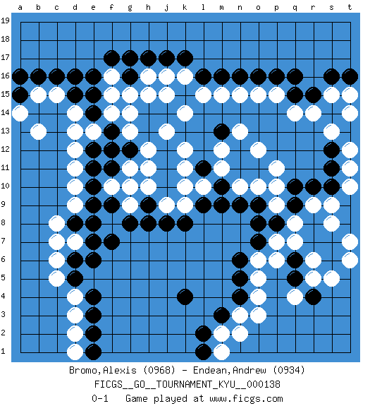 Last move : 0-1 2012 October 10 21:59:52 [Event "FICGS__GO__TOURNAMENT_KYU__000138"] [Site "FICGS"] [Date "2012.09.22"] [Round "1"] [Black "Bromo,Alexis"] [White "Endean,Andrew"] [Result "0-1"] [Rating 1 "0968"] [Rating 2 "0934"] 1.q16 d4 2.d16 q4 3.k4 r14 4.r15 q14 5.q15 p15 6.p16 o15 7.o16 n15 8.n16 k16 9.m16 m15 10.l16 l15 11.k17 j16 12.j17 s15 13.s16 t15 14.t16 s13 15.q10 q7 16.o7 o3 17.n4 n3 18.m3 o5 19.n5 o6 20.n6 p7 21.p8 q8 22.o8 c6 23.e6 c8 24.d8 d7 25.e7 d9 26.e8 d10 27.e10 d12 28.e11 d11 29.e12 d14 30.e14 e13 31.f13 d13 32.d15 c15 33.c16 b15 34.b16 b13 35.d6 c7 36.d5 c5 37.e4 d3 38.e3 d2 39.e2 d1 40.e1 f14 41.e15 g13 42.f12 g15 43.g16 h16 44.h17 f16 45.g17 f15 46.f17 n10 47.m10 m11 48.n9 l10 49.m9 k10 50.l9 k9 51.k8 h10 52.g10 g11 53.g12 h12 54.h13 g14 55.e16 j13 56.h14 h15 57.j14 k14 58.j12 j15 59.j11 h11 60.j10 j9 61.h9 g9 62.h8 f10 63.e9 o10 64.o9 p10 65.q9 r9 66.r10 s9 67.s10 t10 68.r8 s8 69.r7 r6 70.j8 k12 71.l11 k11 72.n11 m12 73.o11 p11 74.n12 n13 75.g8 m2 76.l2 m1 77.l1 n2 78.a15 a14 79.a16 p9 80.f9 f8 81.f7 g10 82.t13 t12 83.s12 t14 84.s11 t11 85.m13 o12 86.q6 p6 87.q5 r5 88.s7 t7 89.s6 s5 90.r4 t6 91.f11 o4 0-1 Here are the names of the openings (joseki) played in the four corners : Corner q16 : q16 r14 Hoshi (Hwajeom, Seongjeom, Xingwei`) 4-4 Point. The star or hoshi (4-4) point, emphasizing influence at the potential expense of territory. Ikken Kakari (Hankan Keolch'im, Yi Gua`jiao~, 1-Space Low Approach). White 2 is the standard approach move to the 4-4. Corner d16 : d16 j16 Hoshi (Hwajeom, Seongjeom, Xingwei`) 4-4 Point. The star or hoshi (4-4) point, emphasizing influence at the potential expense of territory. Player White won this Go (weiqi, baduk) game. Follow this game move after move (download)A basic: Don't push too hard. (Jansteen) Programming can only do so much before it becomes too much. (Don Groves)