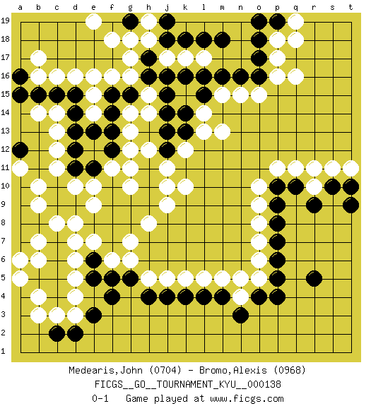 Last move : 0-1 2012 December 2 19:32:19 [Event "FICGS__GO__TOURNAMENT_KYU__000138"] [Site "FICGS"] [Date "2012.09.22"] [Round "1"] [Black "Medearis,John"] [White "Bromo,Alexis"] [Result "0-1"] [Rating 1 "0704"] [Rating 2 "0968"] 1.c4 q16 2.r5 d16 3.q10 d10 4.k4 d5 5.c5 d4 6.f4 g6 7.e6 d6 8.f5 f6 9.e5 c3 10.c6 d7 11.h4 k10 12.k16 h15 13.k13 m13 14.n16 o15 15.o16 n15 16.m16 m15 17.l15 l14 18.k14 l13 19.j15 h14 20.j14 k12 21.h16 g16 22.h17 g17 23.g18 f18 24.f19 e19 25.g19 h18 26.g15 g14 27.f15 f16 28.f14 g13 29.f13 g12 30.f12 f11 31.e11 e10 32.f10 g11 33.d11 c11 34.d13 c12 35.d12 c13 36.d14 e15 37.d15 c14 38.c15 c16 39.j18 h19 40.j19 e14 41.g19 g18 42.f9 e9 43.e8 d8 44.f8 e7 45.f7 g7 46.g8 h8 47.h9 g10 48.g9 j9 49.h10 j10 50.h11 h12 51.e13 e16 52.b15 b16 53.a15 b14 54.a16 b17 55.j12 j11 56.j13 p16 57.o17 p17 58.o18 p18 59.p19 q19 60.o19 q18 61.m18 j17 62.j16 k17 63.k18 l17 64.l18 p11 65.l16 q11 66.p10 o10 67.p7 o8 68.p8 o9 69.p9 o7 70.p6 o6 71.p5 o5 72.o4 n4 73.p4 r10 74.r9 s11 75.s10 r11 76.t10 t11 77.t9 h5 78.g5 j5 79.j4 k5 80.l4 l5 81.m4 m5 82.n3 n5 83.e3 d3 84.d2 b3 85.c7 c8 86.b8 b9 87.a9 b10 88.a10 a11 89.a8 b4 90.b5 b7 91.a7 a5 92.c2 b6 93.a12 a6 0-1 Here are the names of the openings (joseki) played in the four corners : Corner d4 : c4 d5 Komoku (Somok, Xiao~mu`) 3-4 Point. The komoku (3-4) point is the traditional corner enclosure move.. Player White won this Go (weiqi, baduk) game. Follow this game move after move (download)The nature of a game comes from what is played, but it's the sensitivity to the possible and the impossible that gives it value. (Pierre Audouard) It's not enough to succeed. Others must fail. (Gore Vidal)