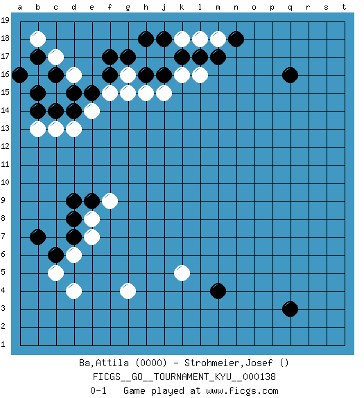 Last move : 0-1 2012 December 4 8:55:19 [Event "FICGS__GO__TOURNAMENT_KYU__000138"] [Site "FICGS"] [Date "2012.09.22"] [Round "1"] [Black "Ba,Attila"] [White "Strohmeier,Josef"] [Result "0-1"] [Rating 1 "0000"] 1.q16 d4 2.q3 d16 3.f17 g16 4.m4 g4 5.g17 h17 6.h18 j17 7.f16 f15 8.j18 k18 9.h16 g15 10.k17 k16 11.l17 h15 12.j16 l18 13.m17 m18 14.n18 k5 15.e15 e14 16.d15 c15 17.d14 d13 18.c14 c13 19.b14 b13 20.c16 b16 21.b15 c17 22.b17 c15 23.a16 b18 24.c16 j15 25.d7 e7 26.d8 e8 27.d9 d6 28.e9 f9 29.c6 c5 30.b7 l16 0-1 Here are the names of the openings (joseki) played in the four corners : Corner d16 : d16 f17 Hoshi (Hwajeom, Seongjeom, Xingwei`) 4-4 Point. The star or hoshi (4-4) point, emphasizing influence at the potential expense of territory. Ikken Kakari (Hankan Keolch'im, Yi Gua`jiao~, 1-Space Low Approach). Black 2 is the standard approach move to the 4-4. Player White won this Go (weiqi, baduk) game. Follow this game move after move (download)Josekis are not fixed, definitive things. They indicate the moments when everything can change. (Pierre Audouard) Beta. Software undergoes beta testing shortly before it's released. Beta is latin for still doesn't work. (Anonymous)