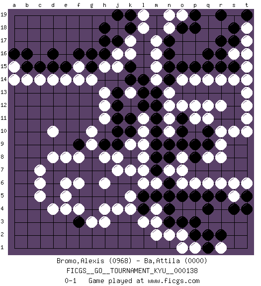 Last move : 0-1 2012 October 6 8:54:23 [Event "FICGS__GO__TOURNAMENT_KYU__000138"] [Site "FICGS"] [Date "2012.09.22"] [Round "1"] [Black "Bromo,Alexis"] [White "Ba,Attila"] [Result "0-1"] [Rating 1 "0968"] [Rating 2 "0000"] 1.q16 d4 2.q4 r10 3.d16 c14 4.c15 d14 5.d15 e14 6.e15 r14 7.r15 q14 8.q15 p14 9.p15 r6 10.r5 q6 11.q5 p6 12.p5 d10 13.k14 g14 14.g15 h15 15.h16 j15 16.k15 j16 17.g16 k16 18.j17 h13 19.j13 h12 20.j12 k17 21.k18 j18 22.h17 l18 23.h18 h3 24.j19 m16 25.n16 h11 26.j11 l3 27.n4 n2 28.o3 c6 29.g7 h8 30.h7 j7 31.j6 o6 32.o5 k7 33.k6 h6 34.h5 l6 35.l5 k5 36.j5 k4 37.l4 j4 38.g6 m6 39.m5 f4 40.g5 k9 41.j10 f8 42.g8 g9 43.h9 j8 44.f9 g10 45.j9 l8 46.f7 e8 47.e7 d8 48.d6 e5 49.d5 c5 50.d7 c7 51.f5 e6 52.g4 g3 53.f3 e4 54.n6 n7 55.n5 o2 56.p3 r1 57.r2 n11 58.p2 o14 59.o15 n18 60.o18 s14 61.s15 b14 62.b15 t15 63.t16 t14 64.n14 s16 65.s17 t17 66.r16 t16 67.s18 a15 68.a16 a14 69.b16 s5 70.s4 s6 71.t4 l11 72.k10 l10 73.m7 l7 74.m8 o8 75.m9 l9 76.m11 m15 77.n15 m14 78.m13 n13 79.m12 n12 80.m10 h4 81.l12 f6 82.k11 h6 83.l14 k13 84.l13 m17 85.n17 o19 86.p19 n19 87.p18 l19 88.k19 t18 89.r17 m3 90.n3 p1 91.q2 o1 92.q1 m2 93.n8 o7 94.o9 n10 95.n9 p11 96.p9 q8 97.q9 r9 98.q10 q11 99.t5 t6 100.o13 f15 101.f16 f14 102.p8 r8 103.p13 s19 104.r19 m4 105.q13 r12 106.r13 t12 107.s13 t13 108.s12 t11 109.s11 s10 110.r11 q12 111.t19 t10 112.o11 o12 113.o10 p12 0-1 Here are the names of the openings (joseki) played in the four corners : Corner d16 : d16 c14 Hoshi (Hwajeom, Seongjeom, Xingwei`) 4-4 Point. The star or hoshi (4-4) point, emphasizing influence at the potential expense of territory. Ikken Kakari (Hankan Keolch'im, Yi Gua`jiao~, 1-Space Low Approach). White 2 is the standard approach move to the 4-4. Corner q16 : q16 r14 Hoshi (Hwajeom, Seongjeom, Xingwei`) 4-4 Point. The star or hoshi (4-4) point, emphasizing influence at the potential expense of territory. Ikken Kakari (Hankan Keolch'im, Yi Gua`jiao~, 1-Space Low Approach). White 2 is the standard approach move to the 4-4. Corner q4 : q4 r6 Hoshi (Hwajeom, Seongjeom, Xingwei`) 4-4 Point. The star or hoshi (4-4) point, emphasizing influence at the potential expense of territory. Ikken Kakari (Hankan Keolch'im, Yi Gua`jiao~, 1-Space Low Approach). White 2 is the standard approach move to the 4-4. Player White won this Go (weiqi, baduk) game. Follow this game move after move (download)Don't make compact groups of stones. (Anonymous) O divine art of subtlety and secrecy! Through you we learn to be invisible, through you inaudible and hence we can hold the enemy's fate in our hands. (Sun Tzu)