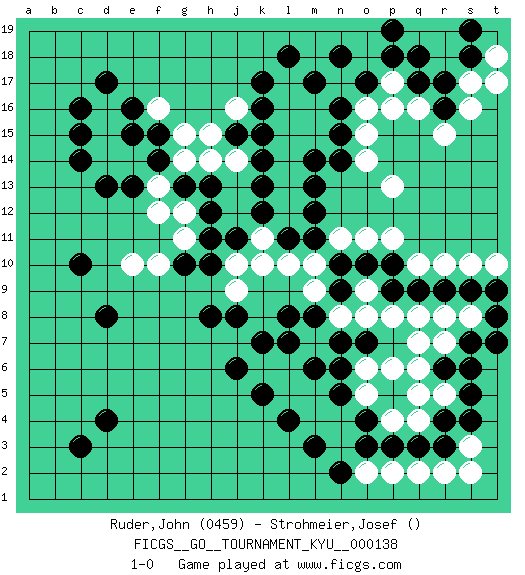 Last move : 1-0 2013 May 21 2:4:32 [Event "FICGS__GO__TOURNAMENT_KYU__000138"] [Site "FICGS"] [Date "2012.09.22"] [Round "1"] [Black "Ruder,John"] [White "Strohmeier,Josef"] [Result "1-0"] [Rating 1 "0459"] 1.g10 q16 2.n10 q4 3.k7 m5 4.k13 q10 5.d4 p13 6.o17 n8 7.p9 p8 8.q9 q8 9.r9 r10 10.s7 r8 11.s9 o9 12.p10 p11 13.o10 m10 14.n9 m9 15.m8 o8 16.m11 l10 17.l11 k10 18.l8 k11 19.k12 n11 20.j11 j10 21.h10 j9 22.h8 s8 23.t8 s10 24.r6 o11 25.t9 t10 26.t7 q6 27.s4 l12 28.m12 l13 29.m13 l14 30.m14 l15 31.h12 q7 32.j8 r5 33.s5 r7 34.s6 s3 35.r3 s2 36.r4 r2 37.q3 q2 38.p3 p2 39.o3 p4 40.o4 o5 41.p5 q5 42.n5 o6 43.n6 p6 44.n7 m15 45.n14 o14 46.n15 o15 47.n16 m16 48.m17 p17 49.r17 s16 50.r16 r15 51.p18 o16 52.q17 p16 53.n18 l17 54.l18 l16 55.k17 j16 56.k16 k15 57.j15 h15 58.k14 j14 59.k15 s17 60.d17 n4 61.o7 m7 62.m6 l6 63.l7 k6 64.j6 n3 65.n2 o2 66.m3 m4 67.l4 r18 68.q18 q19 69.s18 r19 70.p19 t18 71.s19 t17 72.c15 d15 73.c14 d14 74.d13 e14 75.e13 f13 76.f14 g14 77.f15 d16 78.c16 f16 79.e16 g15 80.e15 l5 81.k5 f12 82.g13 g12 83.h13 g11 84.h11 h14 85.c3 f10 86.c10 e10 87.d8 1-0 Here are the names of the openings (joseki) played in the four corners : Corner d4 : d4 j9 Hoshi (Hwajeom, Seongjeom, Xingwei`) 4-4 Point. The star or hoshi (4-4) point, emphasizing influence at the potential expense of territory. Player Black won this Go (weiqi, baduk) game. Follow this game move after move (download)While the Baroque rules of chess could only have been created by humans, the rules of go are so elegant, organic, and rigorously logical that if intelligent life forms exist elsewhere in the universe, they almost certainly play go. (Edward Lasker, international chess master) Without enthusiasm, virtue functions not at all, and vice only poorly. (Mignon McLaughlin, The Neurotic's Notebook, 1960)