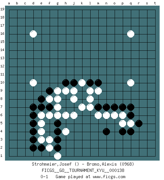 Last move : 0-1 2012 December 3 23:29:15 [Event "FICGS__GO__TOURNAMENT_KYU__000138"] [Site "FICGS"] [Date "2012.09.22"] [Round "1"] [Black "Strohmeier,Josef"] [White "Bromo,Alexis"] [Result "0-1"] [Rating 2 "0968"] 1.d4 q16 2.q4 d16 3.q7 q10 4.d7 d10 5.g4 k7 6.n4 n6 7.n7 m6 8.m7 l7 9.o7 o6 10.p7 p6 11.j7 j6 12.h7 h6 13.g8 g7 14.f7 g6 15.h8 j8 16.g5 f6 17.e7 e6 18.d6 e5 19.d5 e4 20.d3 e3 21.e2 f3 22.g3 f2 23.g2 g1 24.d2 h4 25.k8 l8 26.k9 j9 27.j10 h9 28.h10 g9 29.f9 f8 30.e8 g8 31.q6 p5 32.p4 q5 33.r5 k10 34.l10 l9 35.m10 m9 0-1 This go game has been lost on time (started : 2012.09.22 10:27:3) Here are the names of the openings (joseki) played in the four corners : Player White won this Go (weiqi, baduk) game. Follow this game move after move (download)Learning josekis by heart is useless if you don't try departing from them. (Pierre Audouard) Ah, the Socrating method. The best way we have of teaching everything-apart from juggling chainsaws. (Gregory House, House M.D.)