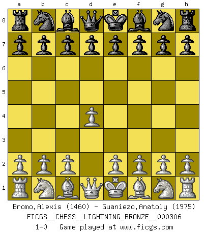 Last move : 1-0 2012 September 22 20:3:59 [Event "FICGS__CHESS__LIGHTNING_BRONZE__000306"] [Site "FICGS"] [Date "2012.09.22"] [Round "1"] [White "Bromo,Alexis"] [Black "Guaniezo,Anatoly"] [Result "1-0"] [WhiteElo "1460"] [BlackElo "1975"] 1.d4 1-0 This chess game has been lost on time (started : 2012.09.22 10:28:3) Queen's pawn Player White won this chess game. Follow this game move after move (download)Chess is above all, a fight ! (Emanuel Lasker) Ein bischen Romantik kann weder im Schach noch in der Liebe schaden. Also versuche ich mich ab und zu daran zu erinnern. (Nigel Short) Antes de los Finales, los dioses han colocado el Juego Medio. (Siegbert Tarrasch) Les Echecs représentent une sphère d'idées créatrices basée sur la volonté des deux protagonistes. (Smyslov) There are more things in heaven and earth than practically anywhere else. (Unknown)
