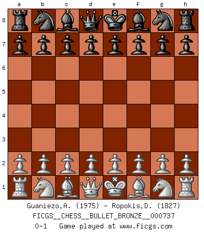 Last move : 0-1 2012 September 22 20:3:59 [Event "FICGS__CHESS__BULLET_BRONZE__000737"] [Site "FICGS"] [Date "2012.09.22"] [Round "1"] [White "Guaniezo,Anatoly"] [Black "Ropokis,Dimitrios"] [Result "0-1"] [WhiteElo "1975"] [BlackElo "1827"] 0-1 This chess game has been lost on time (started : 2012.09.22 12:33:32) Player Black won this chess game. Follow this game move after move (download)Bobby Fischer is the greatest Chess player who has ever lived. (Ken Smith) Wenn Du nicht kämpfst, um anderen etwas zu beweisen, sondern nur für Dich selbst, dann bist du fast unbesiegbar. (Garry Kasparov) El pensamiento metódico es mas útil en el Ajedrez que la inspiración. (C. J. S. Purdy) Les Echecs ont trois composantes : le temps, l'espace et le matériel en dernier. (Mikhail Tal) Fear is the path to the dark side. Fear leads to anger; anger leads to hate; hate leads to suffering. I sense much fear in you. (Master Yoda in Star Wars ep.1)