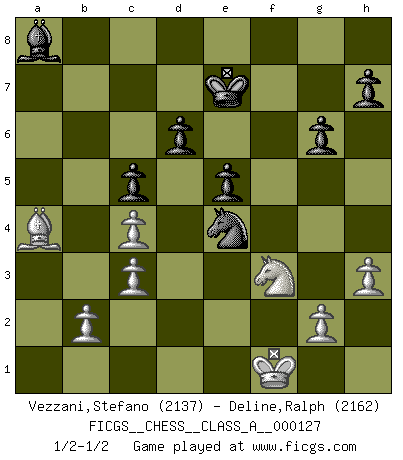 Last move : 1/2-1/2 2012 October 16 22:13:37 [Event "FICGS__CHESS__CLASS_A__000127"] [Site "FICGS"] [Date "2012.09.22"] [Round "1"] [White "Vezzani,Stefano"] [Black "Deline,Ralph"] [Result "1/2-1/2"] [WhiteElo "2137"] [BlackElo "2162"] 1.e4 c5 2.d3 Nc6 3.f4 d6 4.Nf3 g6 5.Be2 Nf6 6.O-O Bg7 7.Qe1 O-O 8.Qh4 b5 9.f5 Rb8 10.Bh6 e6 11.fxe6 fxe6 12.Bxg7 Kxg7 13.Nbd2 e5 14.a4 bxa4 15.Nc4 Na5 16.Rxa4 Nxc4 17.Rxa7+ Rb7 18.Rxb7+ Bxb7 19.dxc4 Nxe4 20.Qxd8 Rxd8 21.Ra1 Rd7 22.c3 Kf6 23.Ra7 Re7 24.Bd1 Bc8 25.Rxe7 Kxe7 26.h3 Bb7 27.Ba4 Ba8 28.Kf1 1/2-1/2 Sicilian defense Kingside Castling by player White (move 6) Kingside Castling by player Black (move 7) This chess game ended in a draw. Follow this game move after move (download)Chess is a cold bath for the mind. (Sir John Simon) Ein Isolani verdüstert die Stimmung auf dem ganzen Schachbrett. (Savielly Grigorievitsch Tartakower) Una clavada es mas poderosa que una espada. (Fred Reinfeld) Botvinnik disait en comparant les échecs à la musique: Il existe une science dont le but est l'étude de l'acoustique et des sons. Mais il y a aussi un art qui se sert de l'océan des sons : c'est la musique. De toute évidence, il en est de même pour la pensée. La logique est l'étude des lois de la réflexion et les échecs reflètent, en tant qu'art, le côté logique de la réflexion, sous la forme d'images artistiques... Extrait de Fischer - Spassky, Reykjavik 1972 par Alexander & F. Wyndham (Ed. Solar), p 37. When it is a question of money, everybody is of the same religion. (Voltaire)