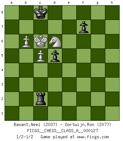 Last move : 1/2-1/2 2013 July 8 7:36:55 [Event "FICGS__CHESS__CLASS_A__000127"] [Site "FICGS"] [Date "2012.09.22"] [Round "1"] [White "Basant,Neel"] [Black "Oortwijn,Ron"] [Result "1/2-1/2"] [WhiteElo "2037"] [BlackElo "2077"] 1.e4 Nc6 2.d4 d5 3.Nc3 dxe4 4.d5 Nb8 5.Nxe4 c6 6.Bc4 cxd5 7.Qxd5 Qxd5 8.Bxd5 e6 9.Bc4 Bd7 10.Bf4 Bc6 11.f3 Bxe4 12.fxe4 Nc6 13.Nf3 Nf6 14.e5 Nd7 15.O-O-O a6 16.Rhe1 Be7 17.c3 h6 18.Kc2 Rc8 19.Be2 g5 20.Bg3 h5 21.h3 g4 22.hxg4 hxg4 23.Nd4 Ndxe5 24.Bxe5 Nxe5 25.Bxa6 bxa6 26.Rxe5 Rh2 27.Rd2 Bf6 28.R5e2 Bg5 29.Rd3 Bf4 30.b4 Bc7 31.a4 Rd8 32.Nb3 g3 33.c4 Rh4 34.Kc3 Bd6 35.R2e3 Rf4 36.b5 axb5 37.axb5 Rf2 38.b6 Bf4 39.Rxg3 Bxg3 40.Rxg3 Rf5 41.c5 Kd7 42.Kb4 Ra8 43.Rd3+ Kc8 44.Kb5 Ra2 45.Kc6 Rd5 46.Rxd5 exd5 47.Nd4 Rxg2 48.Nb5 Rc2 49.Nd6+ 1/2-1/2 KP : Nimzovich defense, Bogolyubov variation Queenside Castling by player White (move 15) 10 pieces endgame at move 46 : White KRNPPP , Black KRPP WHITE : King + 1 Rook 1 Knight 3 Pawns BLACK : King + 1 Rook 2 Pawns 9 pieces endgame at move 46 : White KNPPP , Black KRPP WHITE : King + 1 Knight 3 Pawns BLACK : King + 1 Rook 2 Pawns 8 pieces endgame at move 47 : White KNPP , Black KRPP WHITE : King + 1 Knight 2 Pawns BLACK : King + 1 Rook 2 Pawns This chess game ended in a draw. Follow this game move after move (download)We like to think. (Gary Kasparov) Schach ist das schnellste Spiel der Welt, weil man in jeder Sekunde Tausende von Gedanken ordnen muß. (Albert Einstein) Muchos se han convertido en Maestros de Ajedrez, nadie se ha convertido en el Maestro del Ajedrez. (Siegbert Tarrasch) Horreur, mais aussi harmonie suprême : qu'y avait-il en effet au monde en dehors des échecs ? Le brouillard, l'inconnu, le non-être... (Vladimir Nabokov) Employ the attack like tactic of defense. (Chinese proverb)