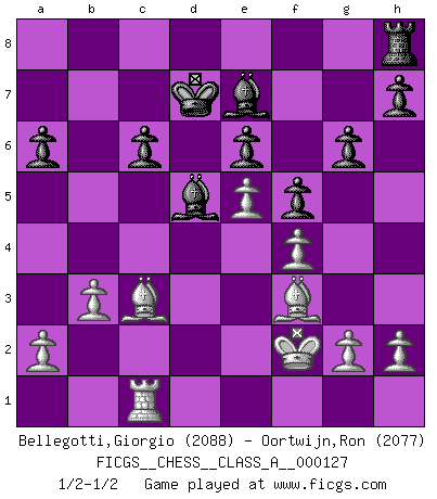 Last move : 1/2-1/2 2012 November 16 9:16:2 [Event "FICGS__CHESS__CLASS_A__000127"] [Site "FICGS"] [Date "2012.09.22"] [Round "1"] [White "Bellegotti,Giorgio"] [Black "Oortwijn,Ron"] [Result "1/2-1/2"] [WhiteElo "2088"] [BlackElo "2077"] 1.e4 c6 2.d4 d5 3.e5 Bf5 4.Nf3 e6 5.Be2 c5 6.Be3 cxd4 7.Nxd4 Ne7 8.c4 Nbc6 9.Qa4 a6 10.Na3 Qa5+ 11.Qxa5 Nxa5 12.O-O dxc4 13.Nxc4 Nxc4 14.Bxc4 Be4 15.Rac1 Bd5 16.Be2 Rc8 17.Rxc8+ Nxc8 18.Rc1 Ne7 19.Bd2 Kd7 20.Ba5 Nc6 21.Nxc6 bxc6 22.b3 g6 23.f4 Be7 24.Kf2 f6 25.Bc3 f5 26.Bf3 1/2-1/2 Caro-Kann : Advance variation Kingside Castling by player White (move 12) This chess game ended in a draw. Follow this game move after move (download)Chess is a matter of delicate judgment, knowing when to punch and how to duck. (Bobby Fischer) Ich erzeugte keinen Neid, da mich die Schachspieler als Musiker und die Musiker als Schachspieler betrachteten. (Mark Taimanov) La batalla por la última verdad nunca sera ganada. Y es por eso que el Ajedrez es tan fascinante. (Hans Kmoch) Tous ces prétendus hommes politiques sont les pions, les Cavaliers, les Tours ou les Fous d'une partie d'échecs qui se jouera tant qu'un hasard ne renversera pas l'échiquier. (Honoré de Balzac) If you don't practice you don't deserve to win. (Andre Agassi)