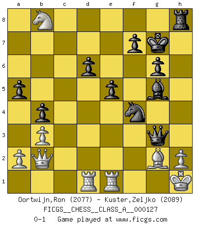 Last move : 0-1 2012 November 22 11:16:20 [Event "FICGS__CHESS__CLASS_A__000127"] [Site "FICGS"] [Date "2012.09.22"] [Round "1"] [White "Oortwijn,Ron"] [Black "Kuster,Zeljko"] [Result "0-1"] [WhiteElo "2077"] [BlackElo "2089"] 1.Nf3 Nf6 2.b3 g6 3.g3 Bg7 4.Bb2 O-O 5.Bg2 d6 6.d4 c5 7.dxc5 Qa5+ 8.Nbd2 Qxc5 9.e3 Qc7 10.c4 Na6 11.Qe2 Nc5 12.O-O Bf5 13.Ne1 Rfd8 14.f3 h5 15.e4 Bd7 16.Nb1 a5 17.Nc2 h4 18.gxh4 b5 19.Nba3 b4 20.Nb5 Bxb5 21.cxb5 Ne6 22.Kh1 Qc5 23.Rac1 Bh6 24.Rcd1 Rab8 25.Rfe1 Nf4 26.Qd2 Qxb5 27.Bxf6 exf6 28.Nd4 Qc5 29.h5 Qxh5 30.Nc6 Bg5 31.Nxb8 Kg7 32.e5 fxe5 33.Qb2 Rh8 34.Bf1 Qxf3+ 35.Bg2 Qg3 0-1 Reti Opening Kingside Castling by player Black (move 4) Kingside Castling by player White (move 12) Player Black won this chess game. Follow this game move after move (download)When I asked Fischer why he had not played a certain move in our game, he replied: 'Well, you laughed when I wrote it down !' (Mikhail Tal) Ich möchte Schüler heranbilden, die das Vermögen haben, selbst zu denken und Kritik zu üben. (Emanuel Lasker) Muchos jugadores de Ajedrez se sorprendían cuando después de la partida, Fischer explicaba con calma: 'Yo ya había analizado esta posibilidad' en una posición en la cual yo creía que no era posible de prever desde la apertura. (Mikhail Tal) Aidez vos pièces, elles vous aideront. (Paul Morphy) Even the best needles are not sharp at both ends. (Chinese proverb)